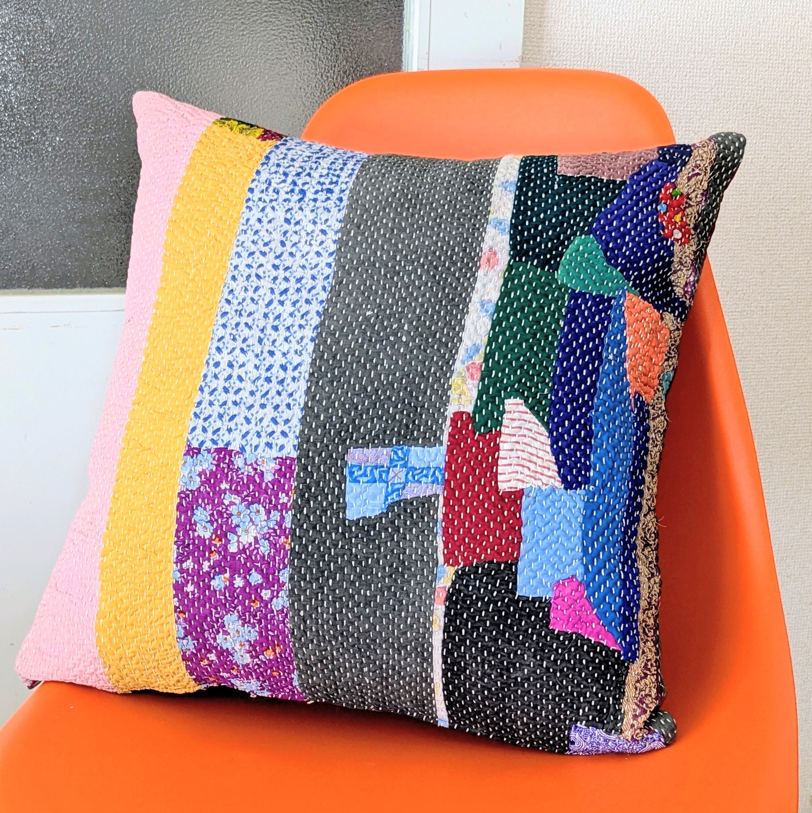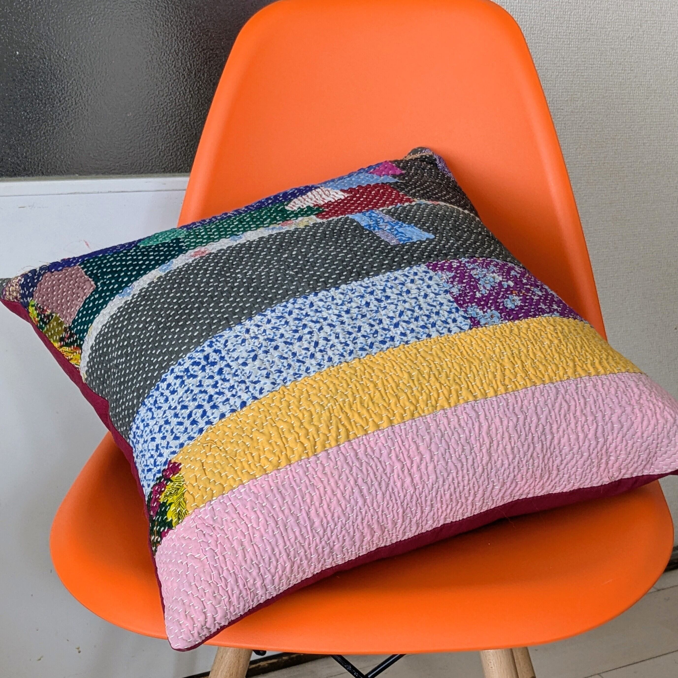 ヴィンテージラリーキルトのクッション 45x45cm 刺し子 刺繍布 パッチワーク