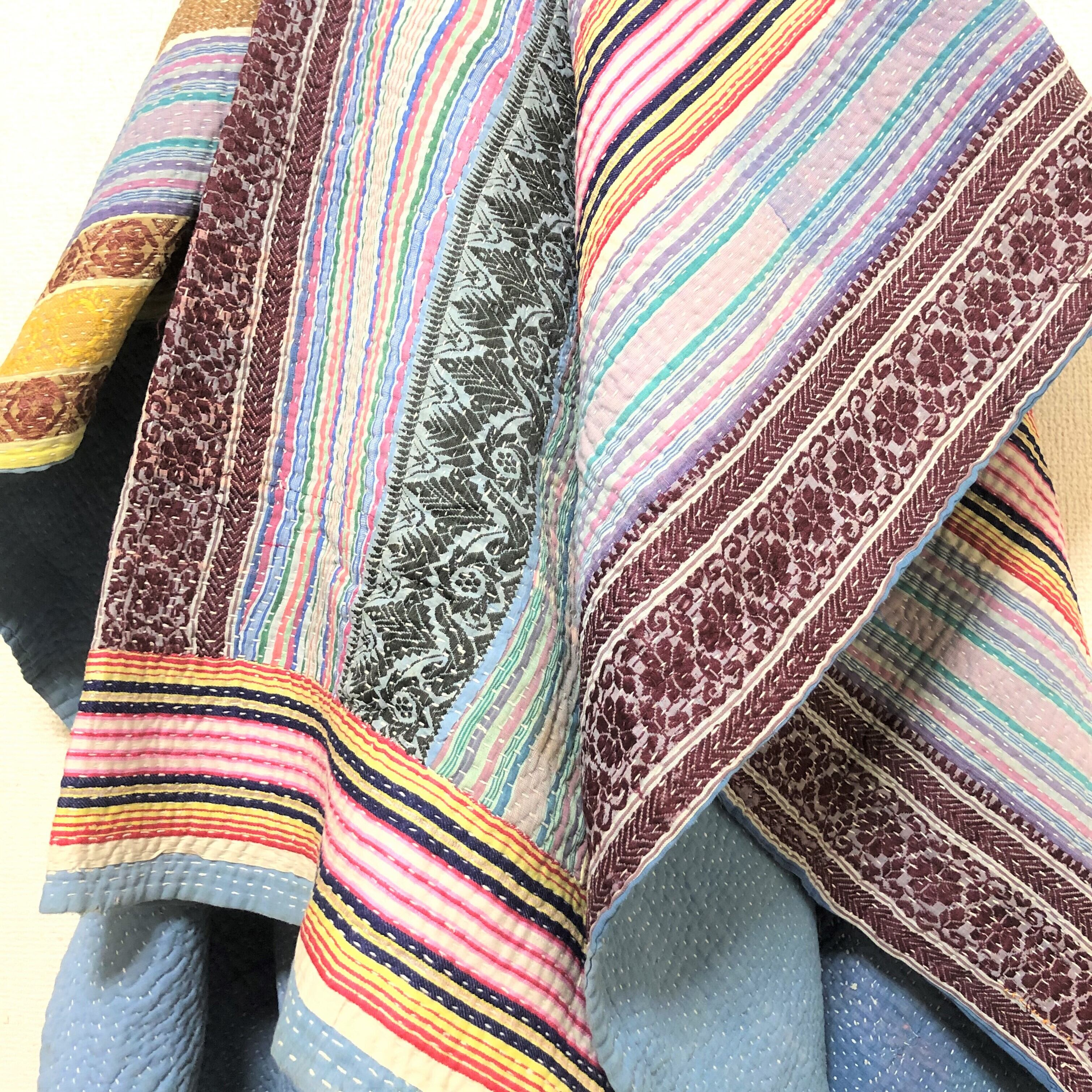 ストライプのラリーキルト 刺し子 刺繍 エスニック ハンドメイド インド マルチカバー