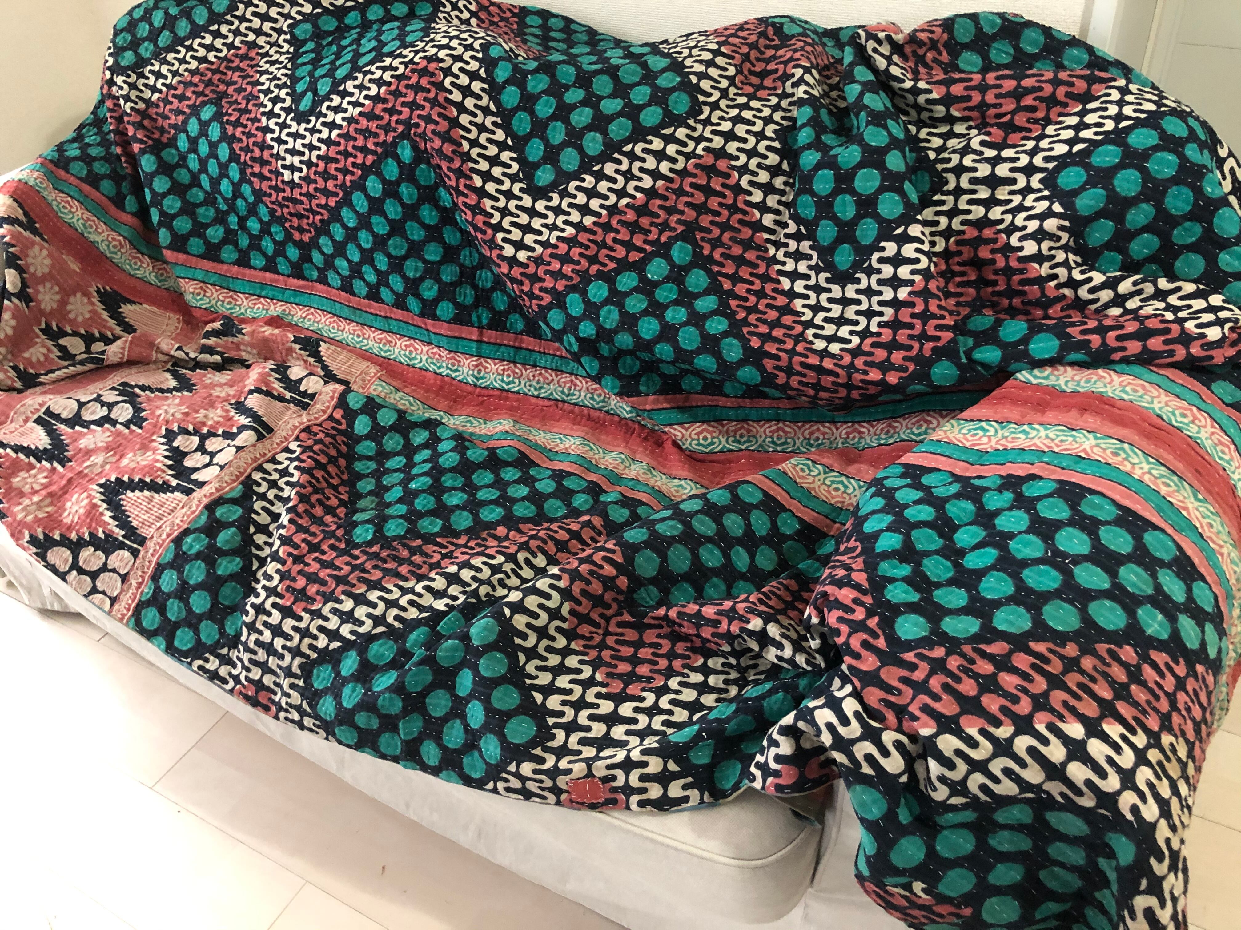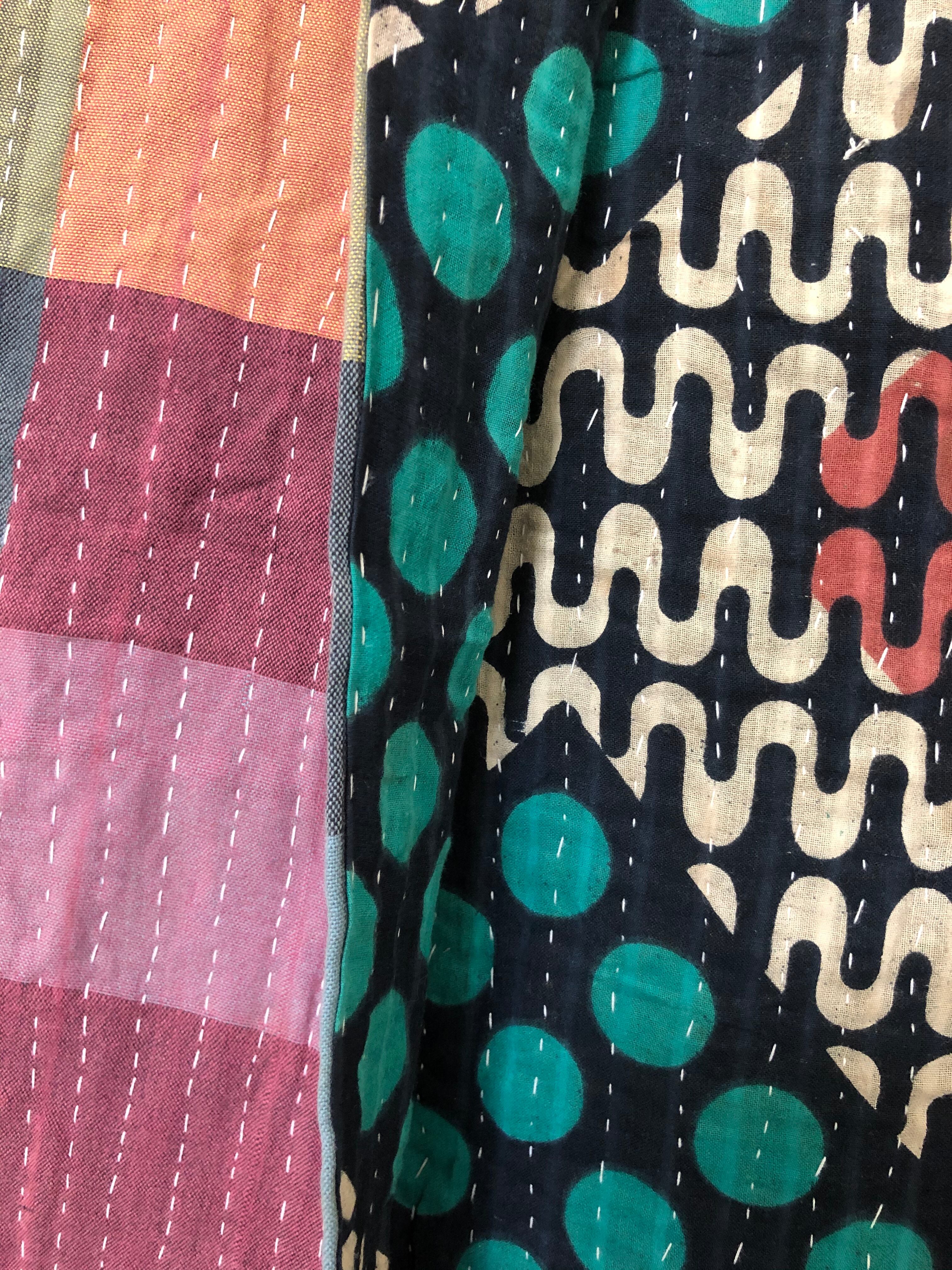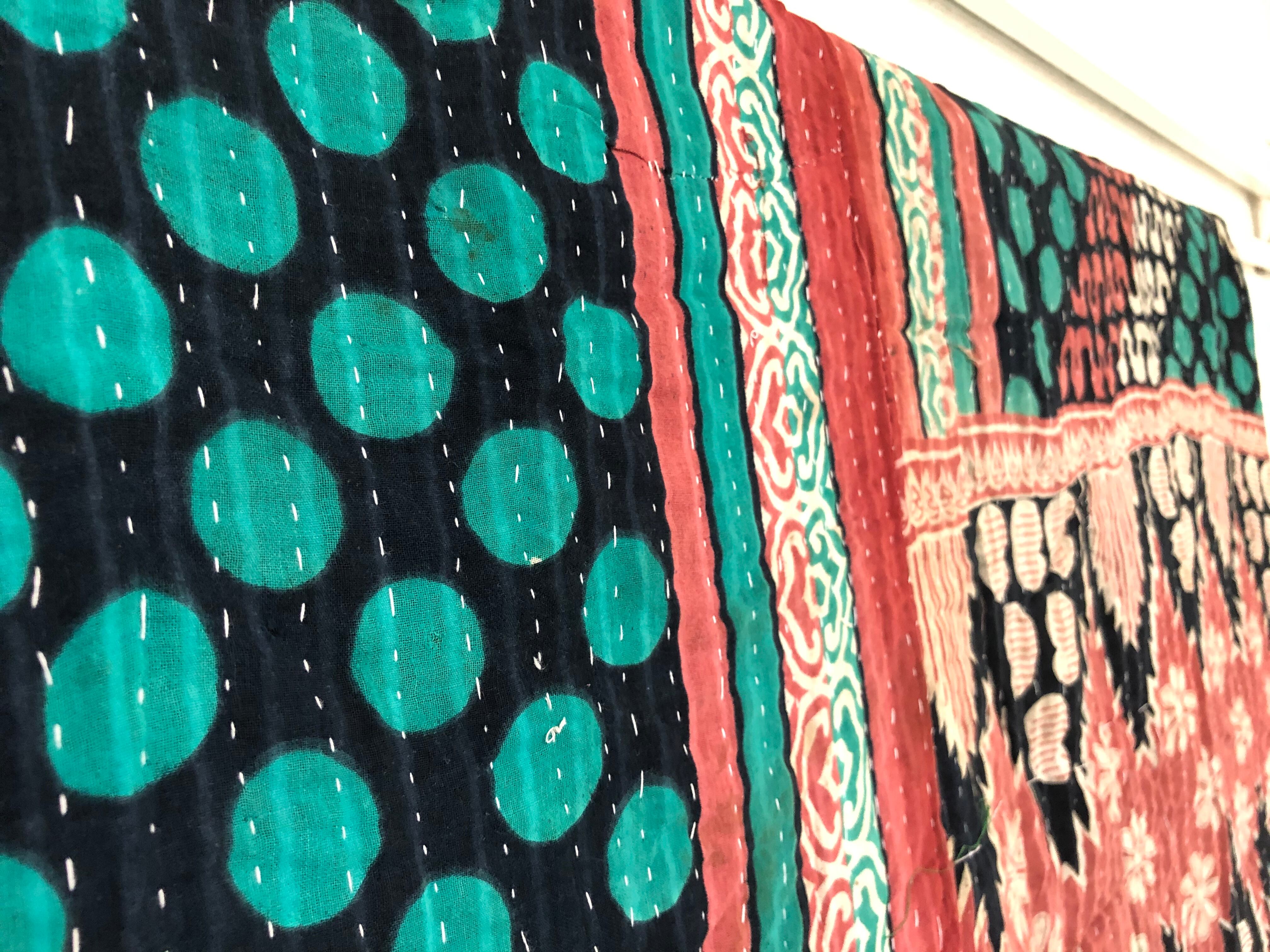ミドリドットとピンクの波模様のラリーキルト エスニック 刺し子 刺繍 ハンドメイド 古布
