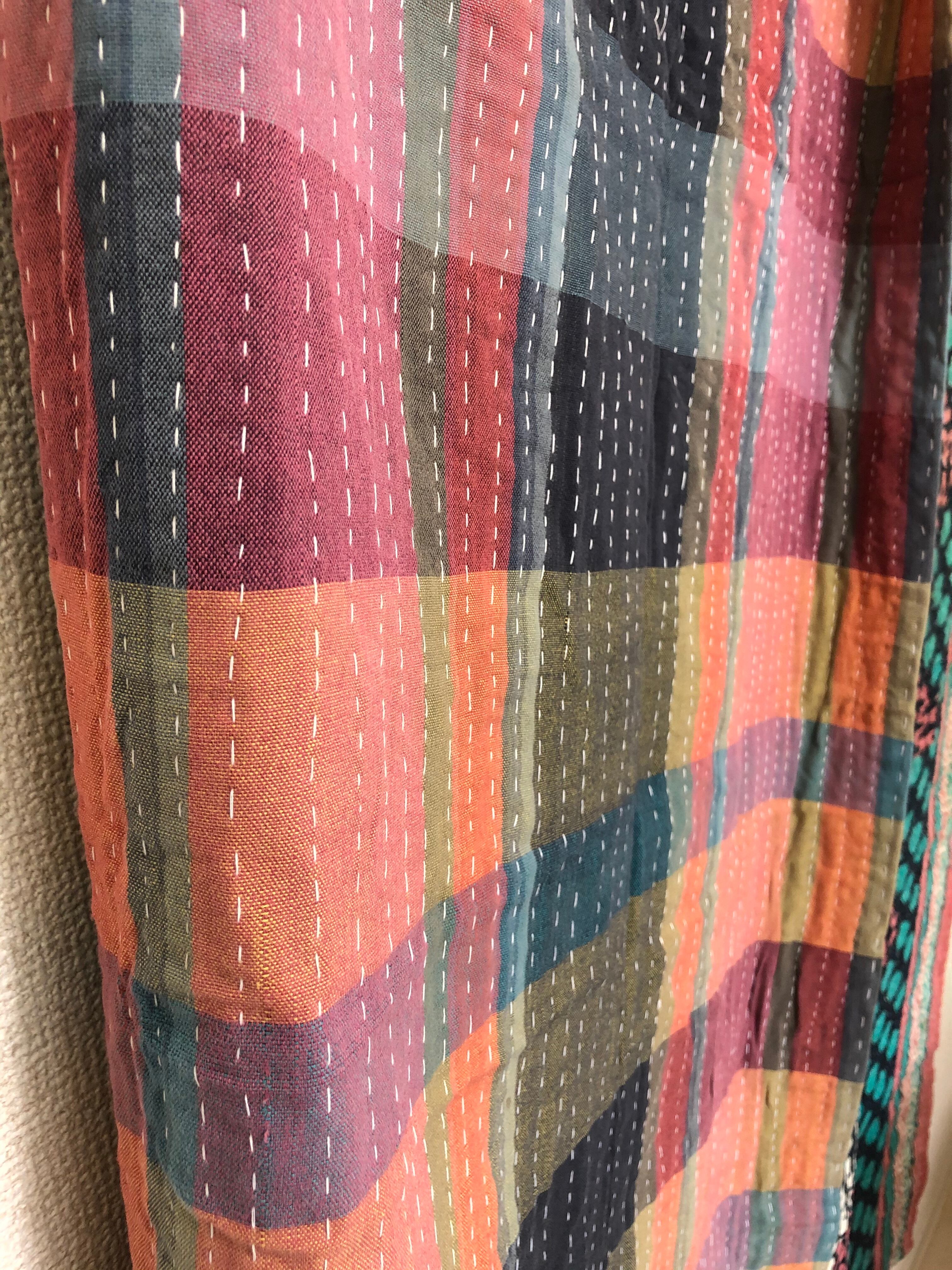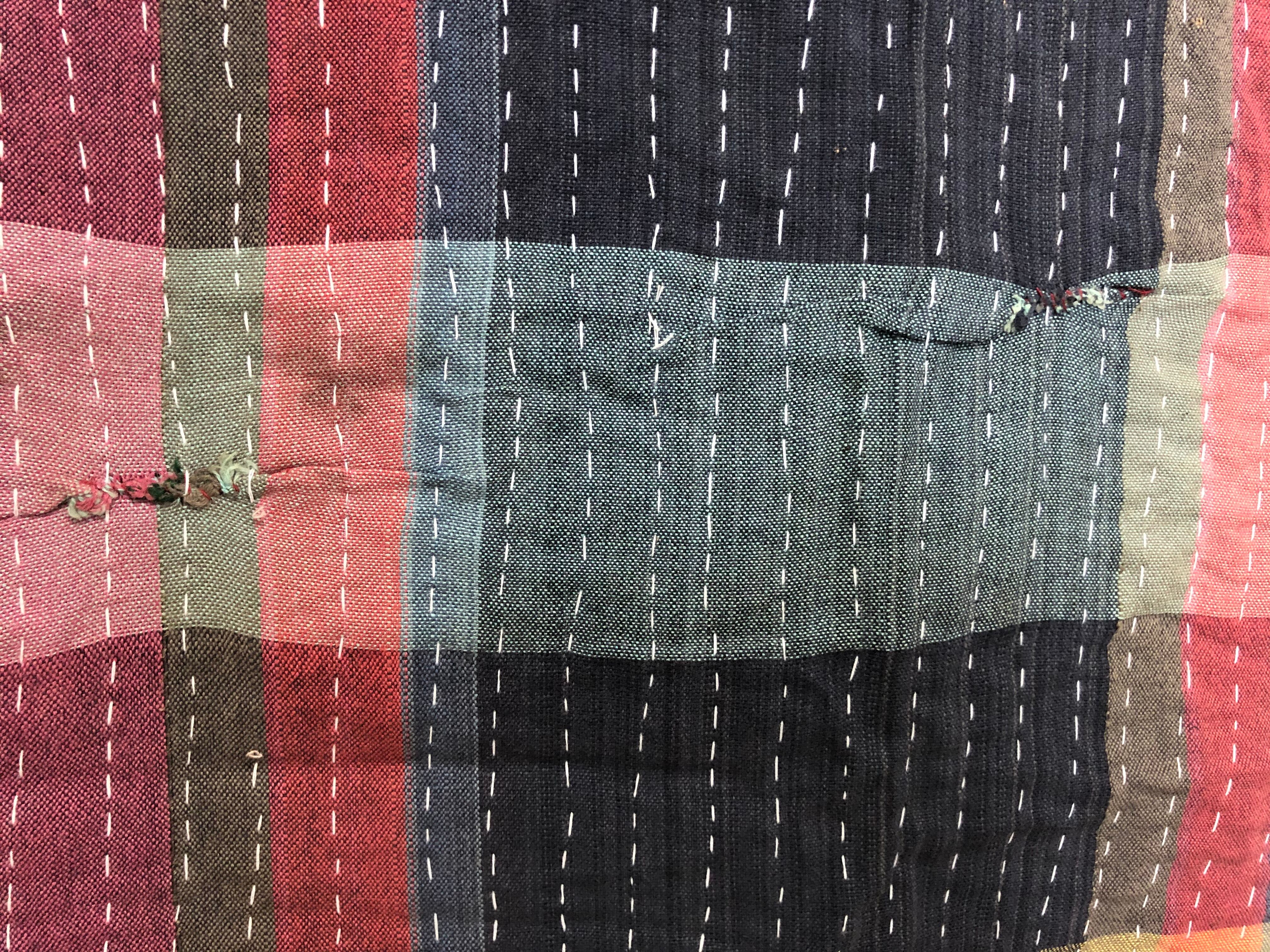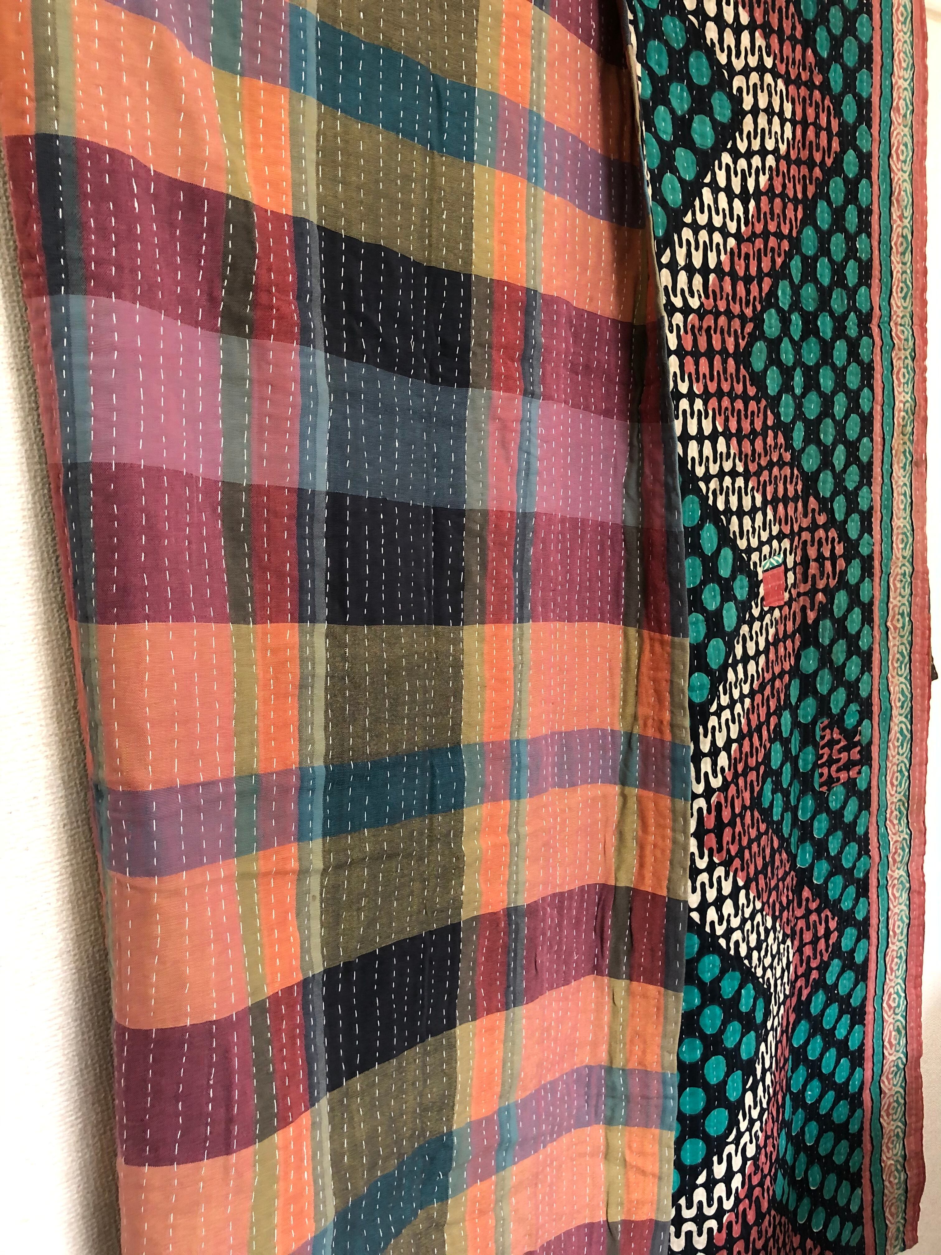 ミドリドットとピンクの波模様のラリーキルト エスニック 刺し子 刺繍 ハンドメイド 古布