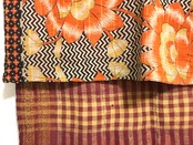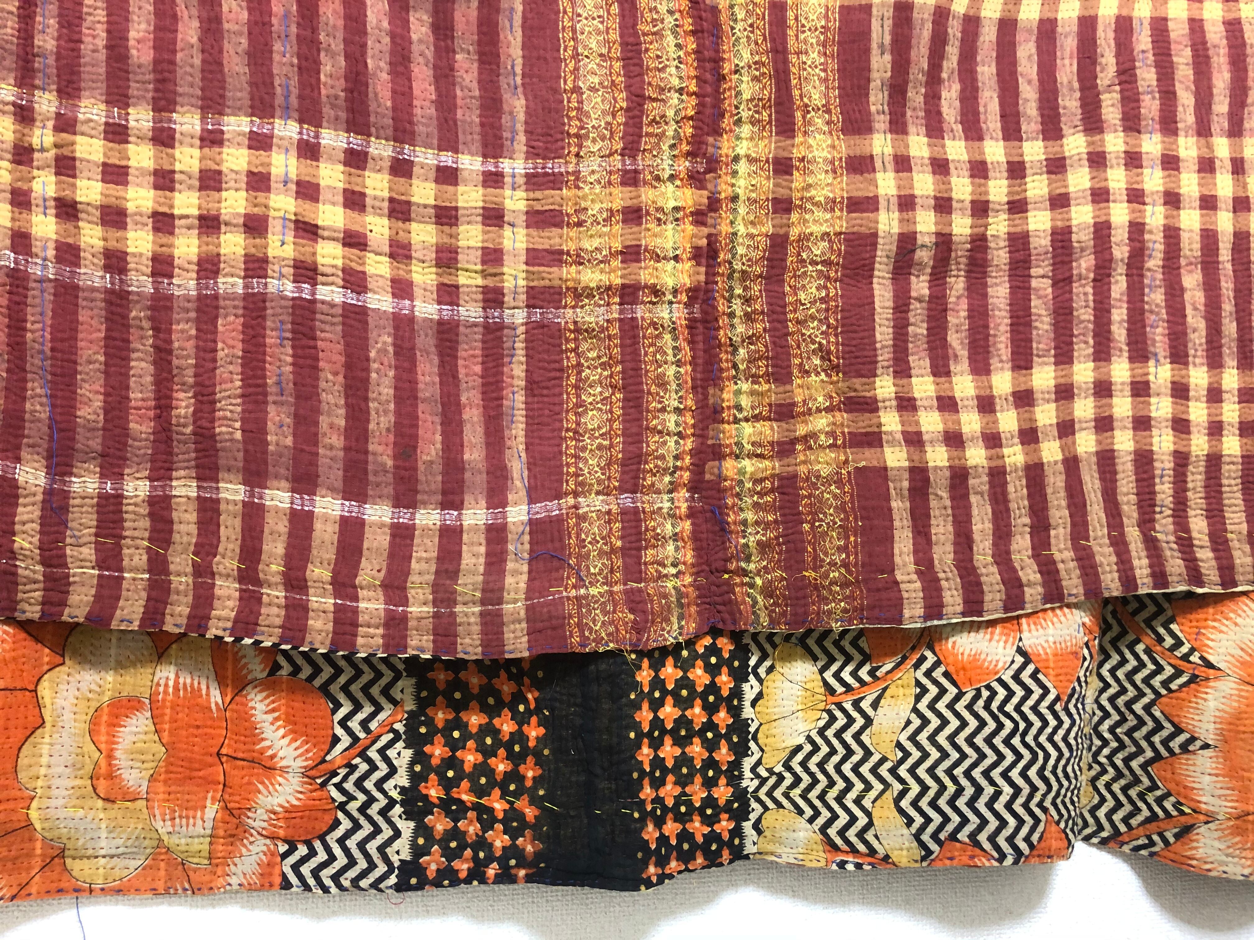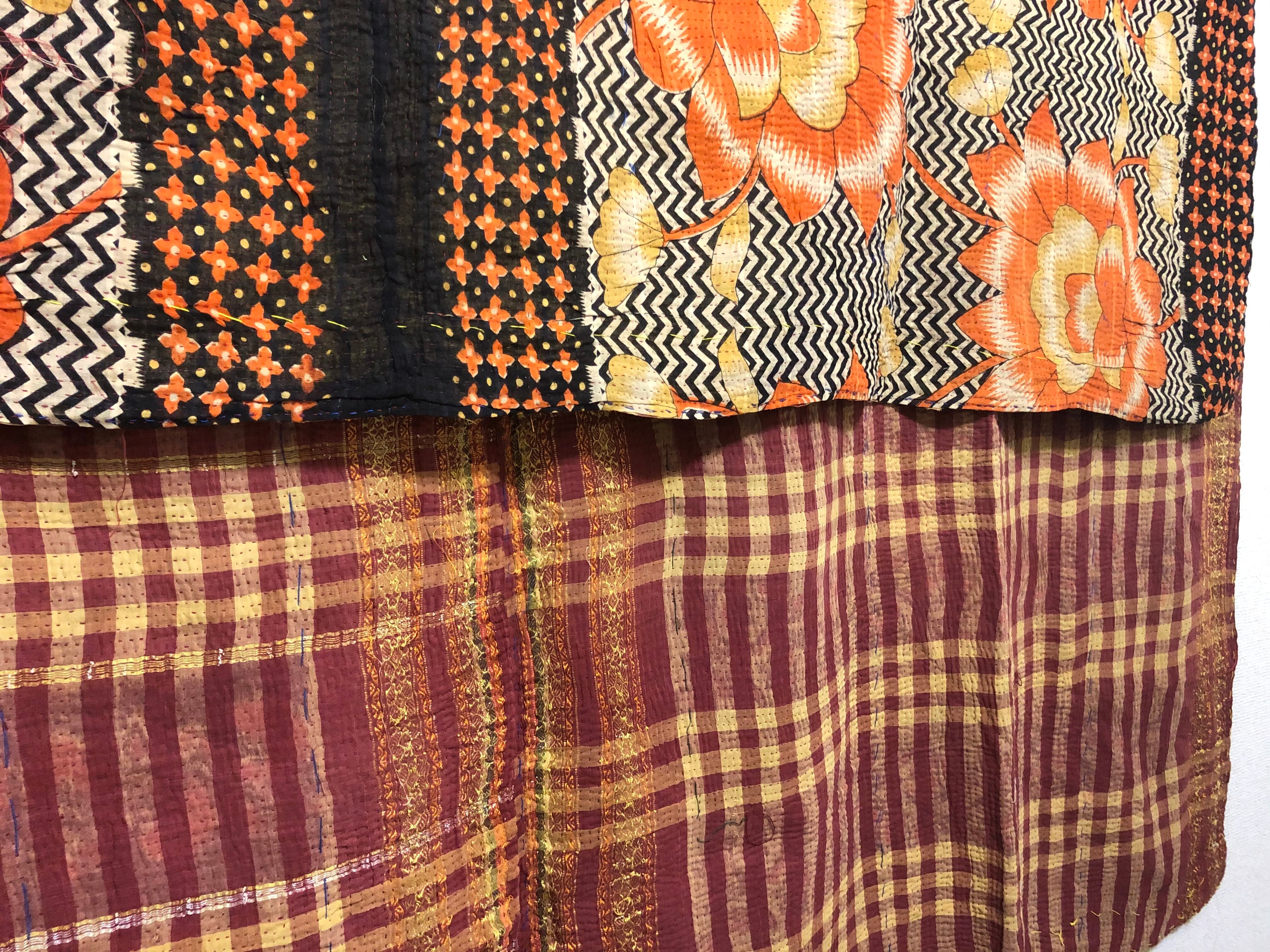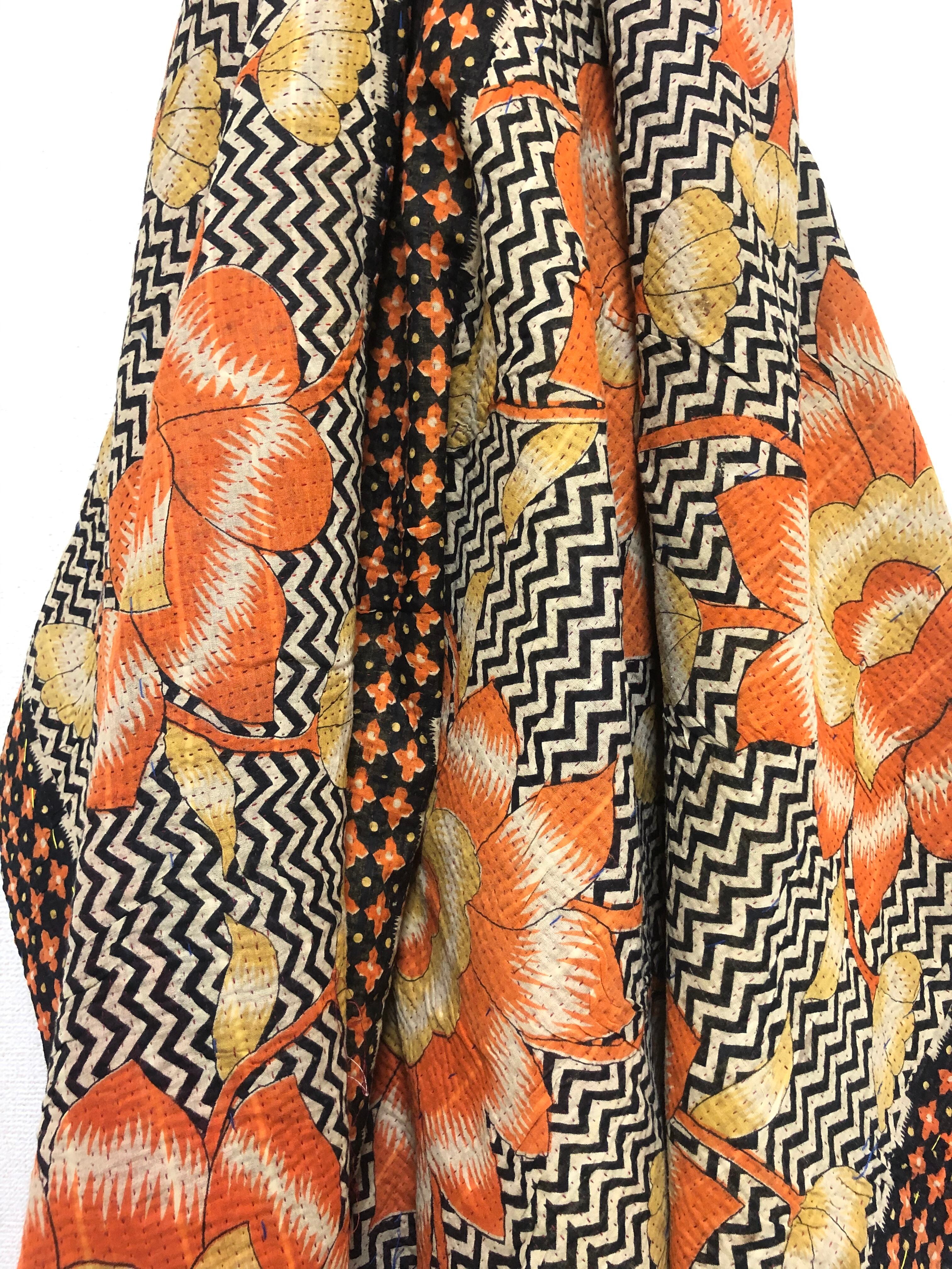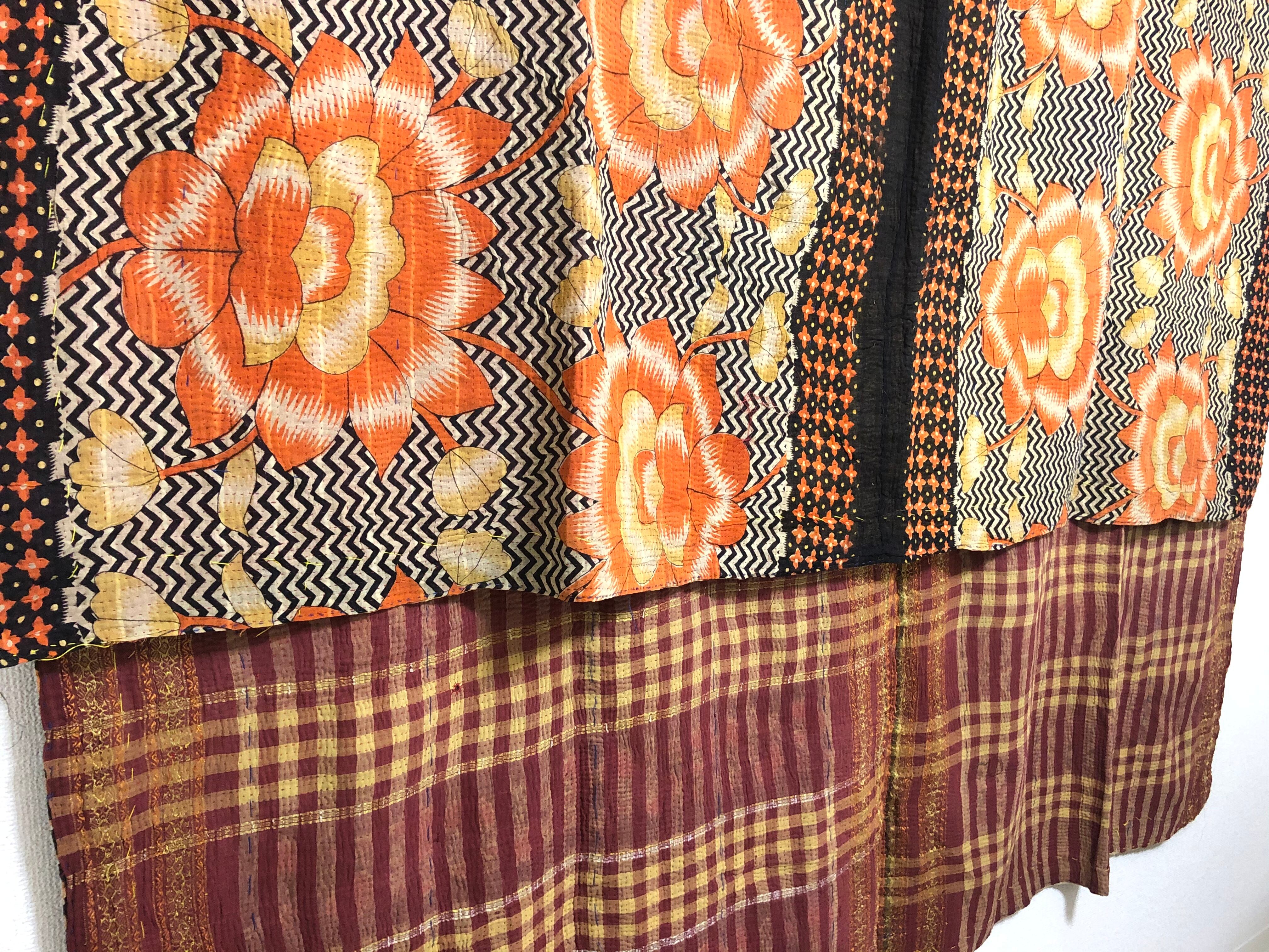 落ち着いたオレンジの花柄ラリーキルト エスニック 刺繍 刺し子 古布 ハンドメイド
