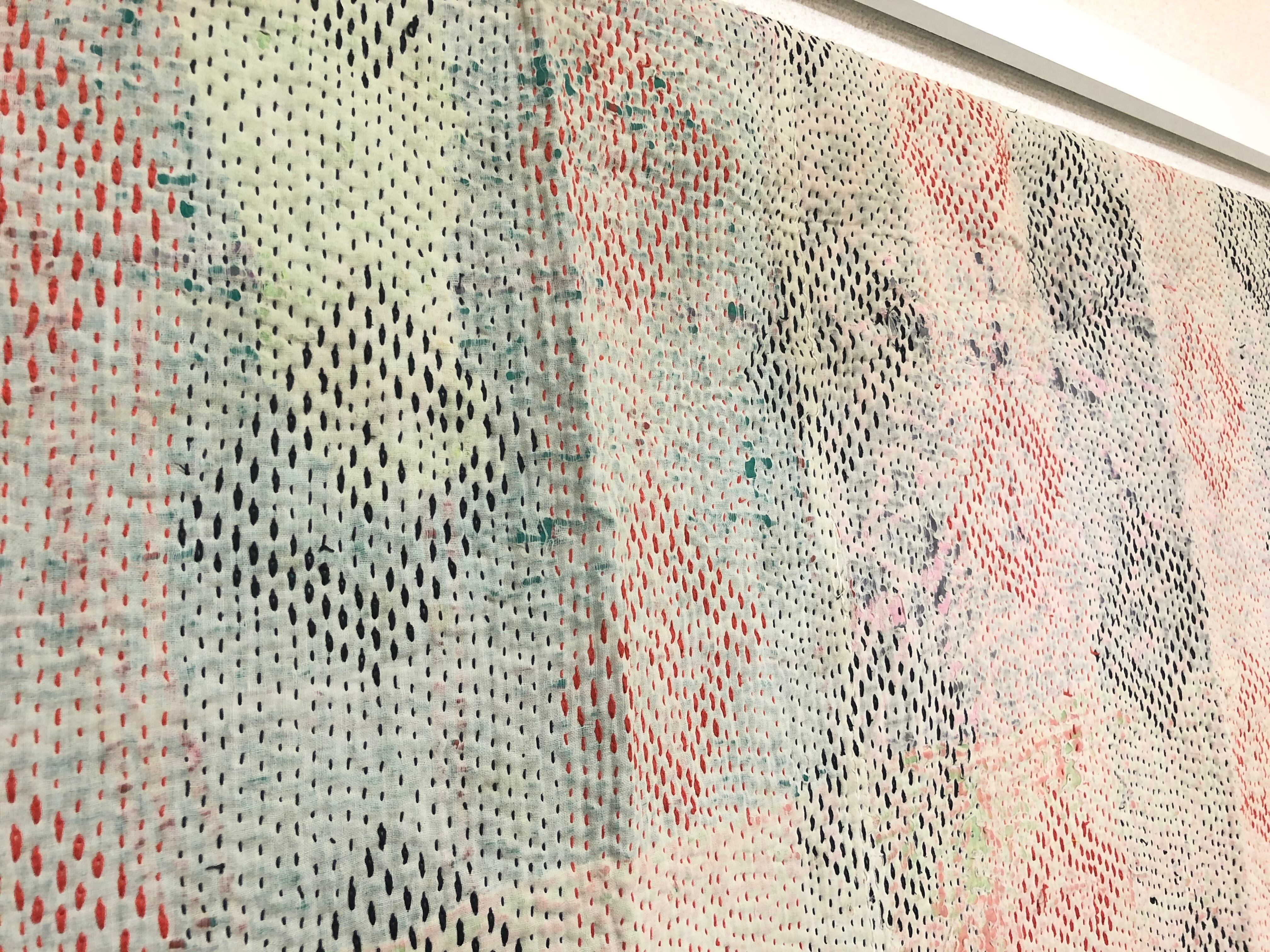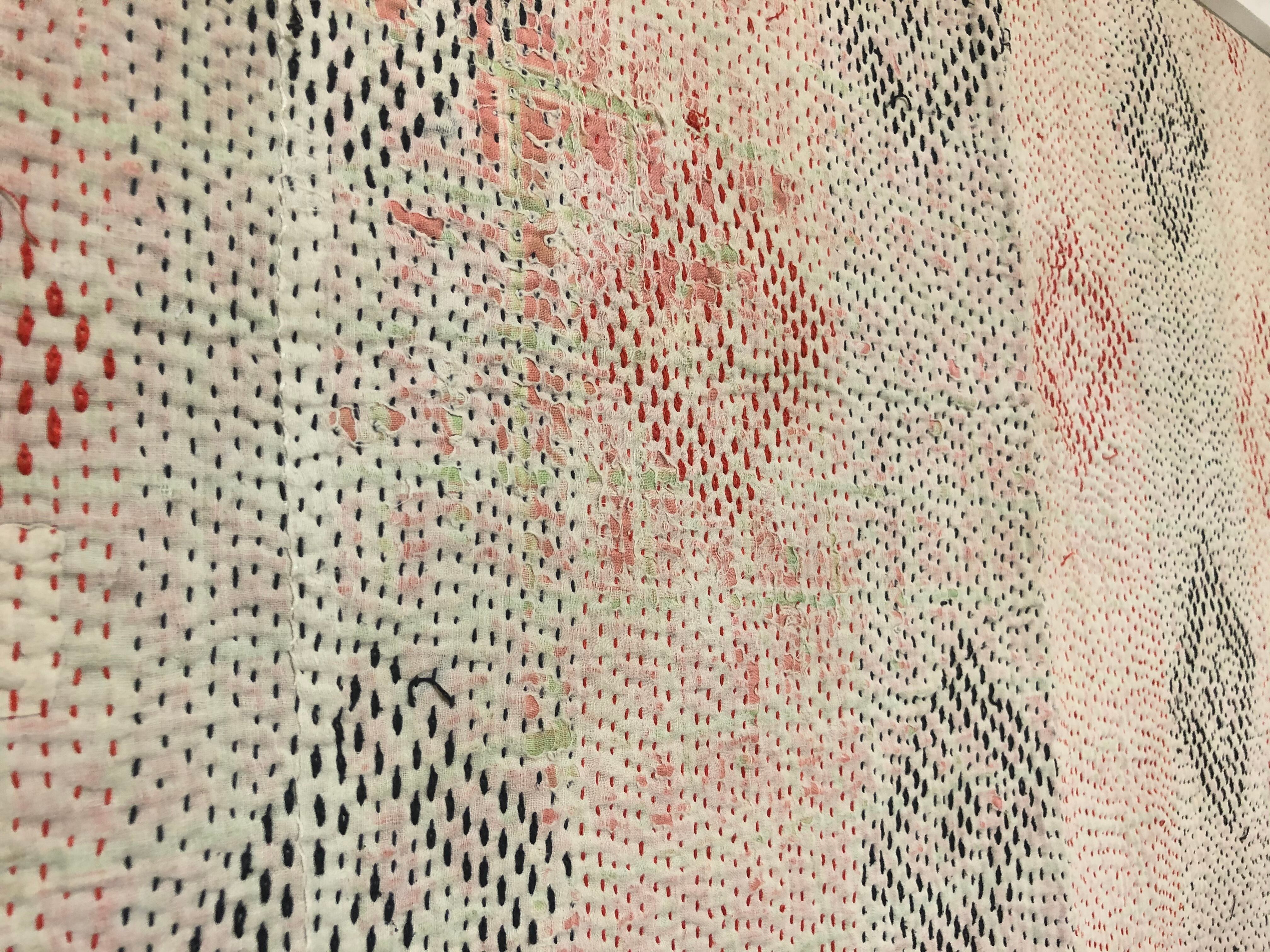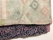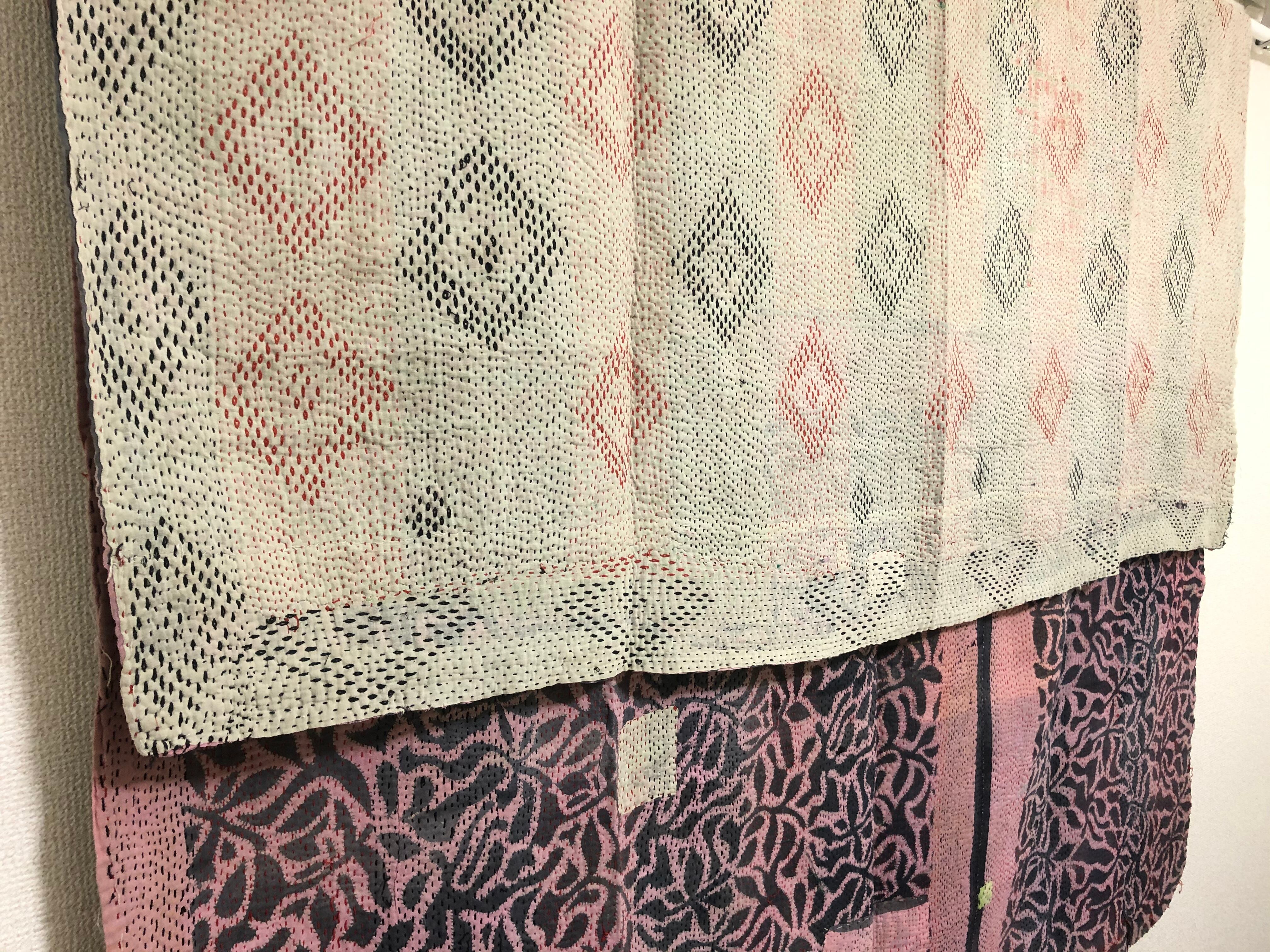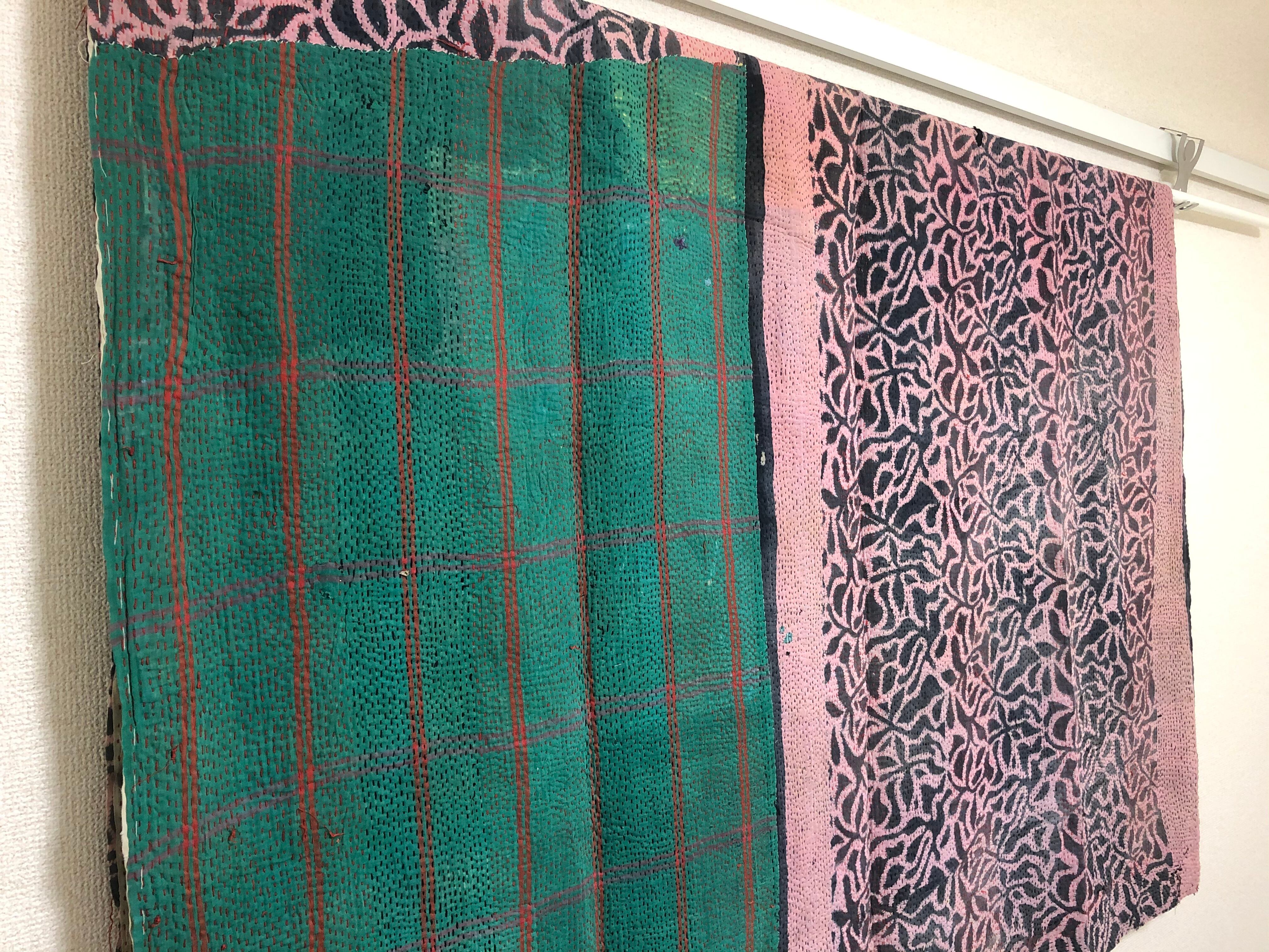 裏がミドリとピンクの生成りラリーキルト 刺繍 刺し子 エスニック ハンドメイド