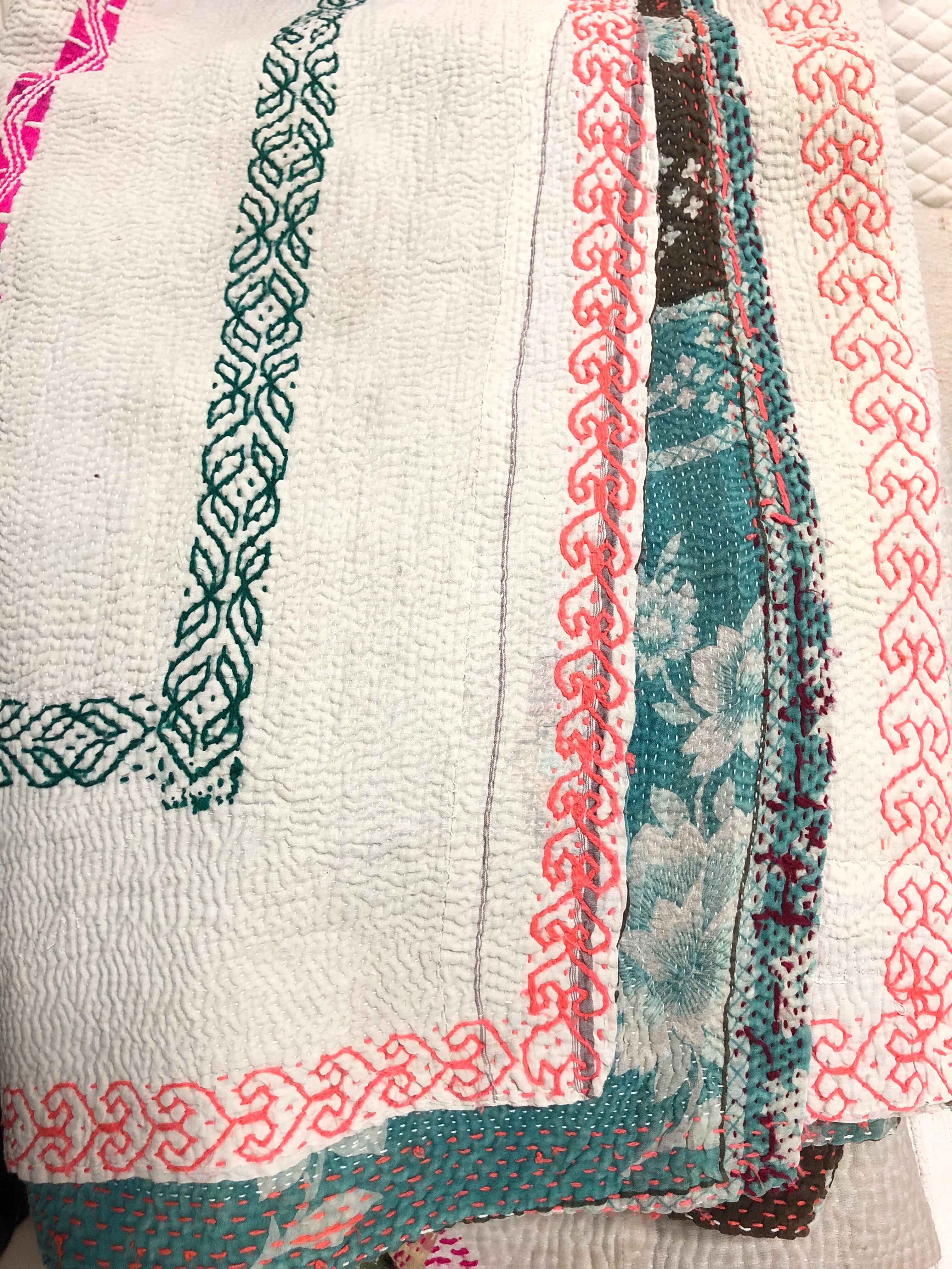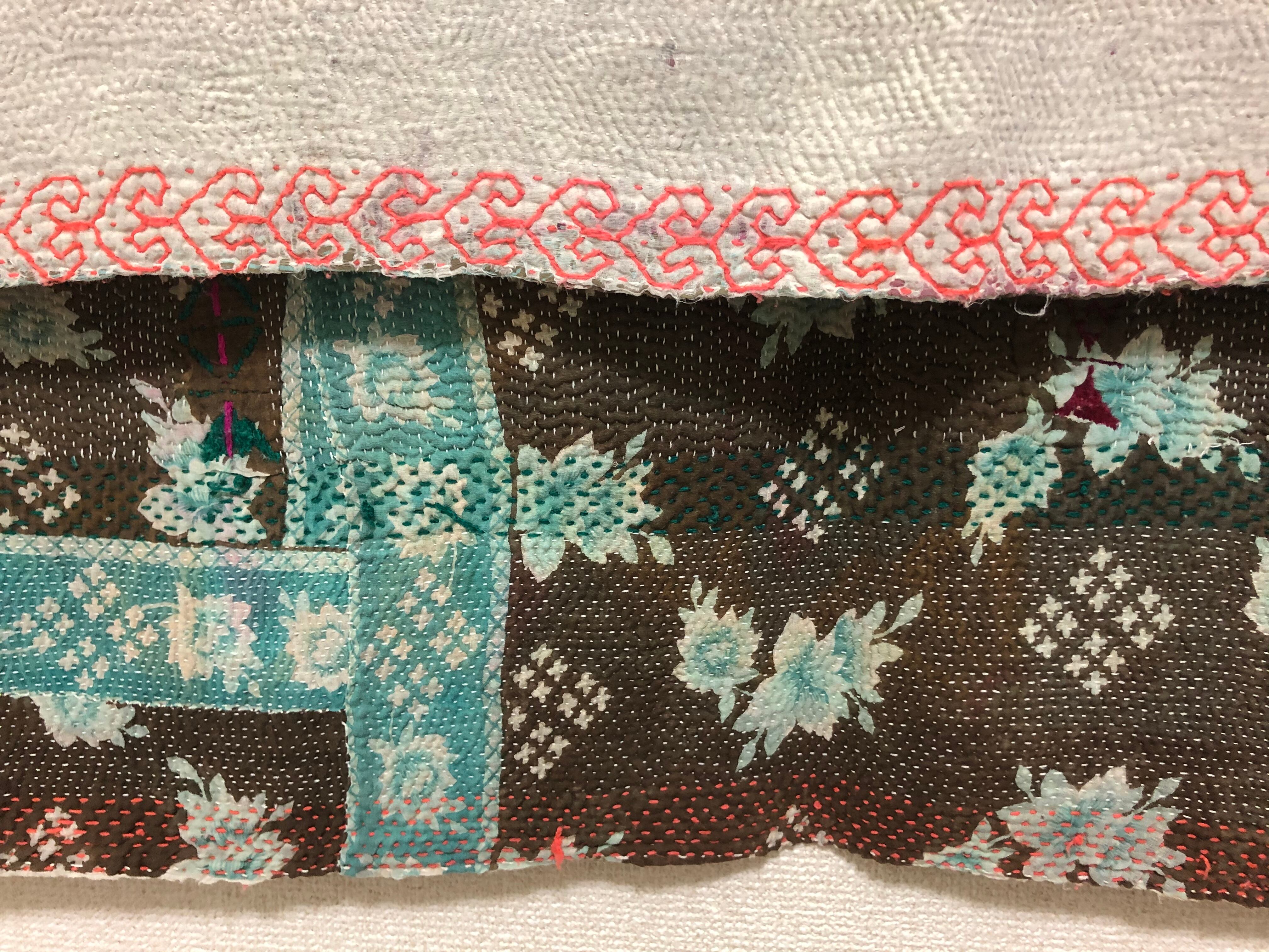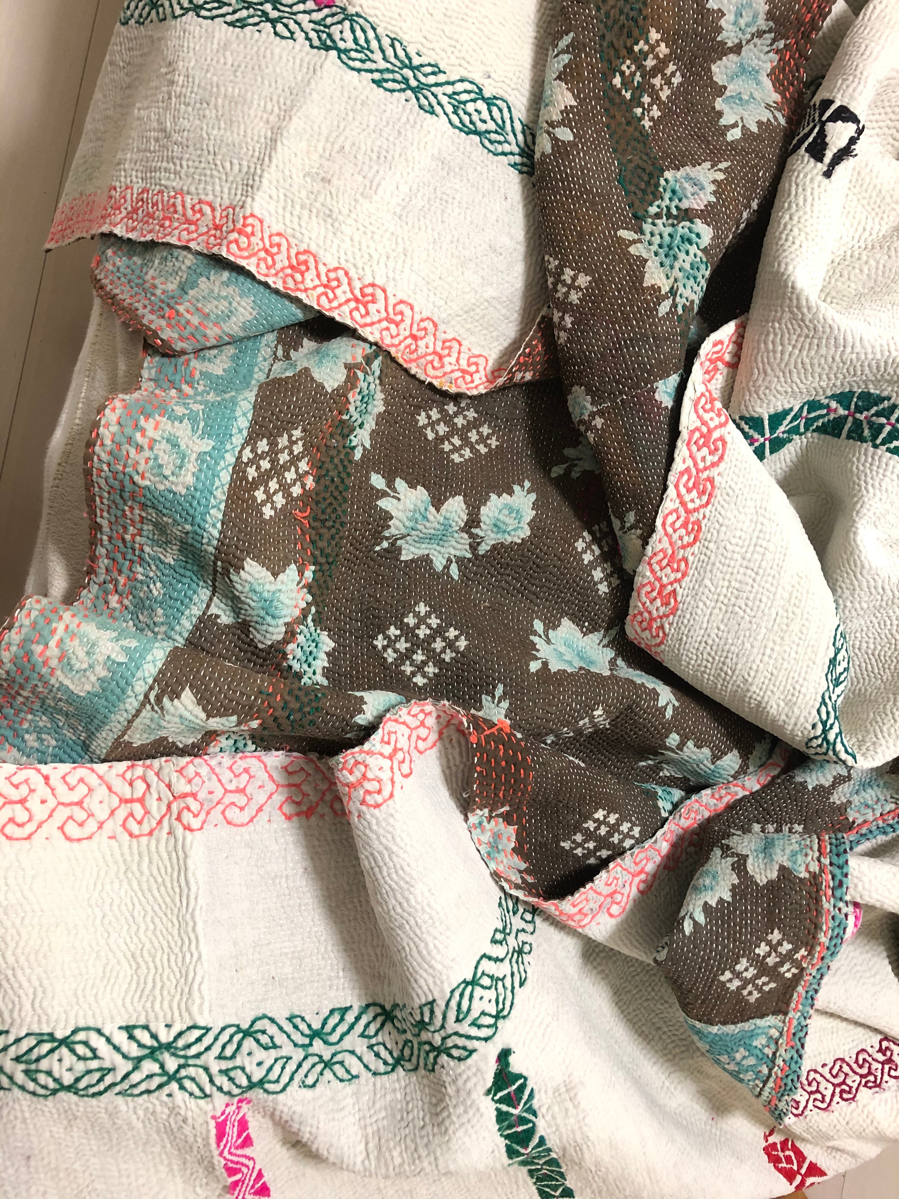 裏がお花柄の生成りヴィンテージラリーキルト 刺繍 刺し子 ハンドメイド エスニック