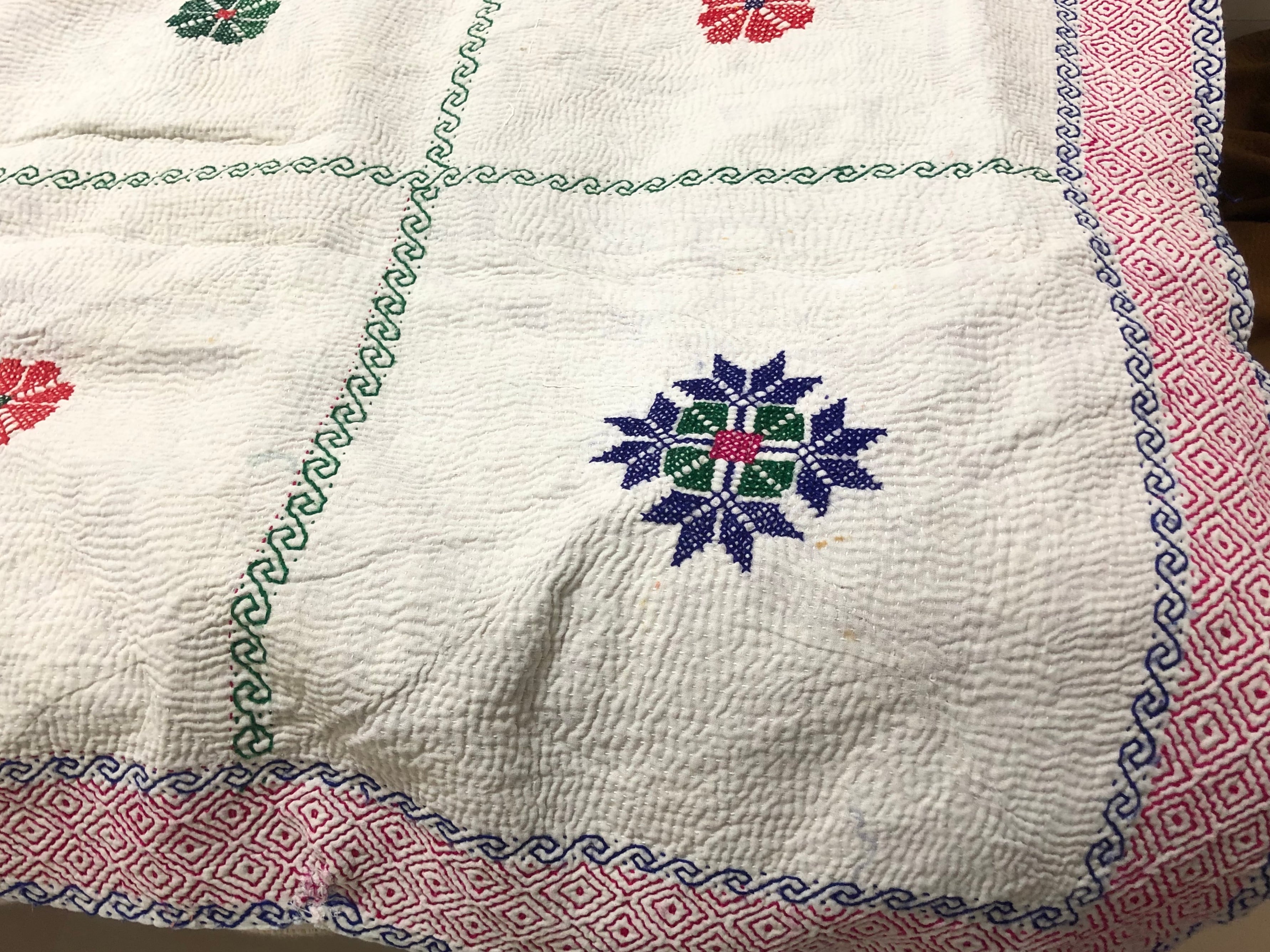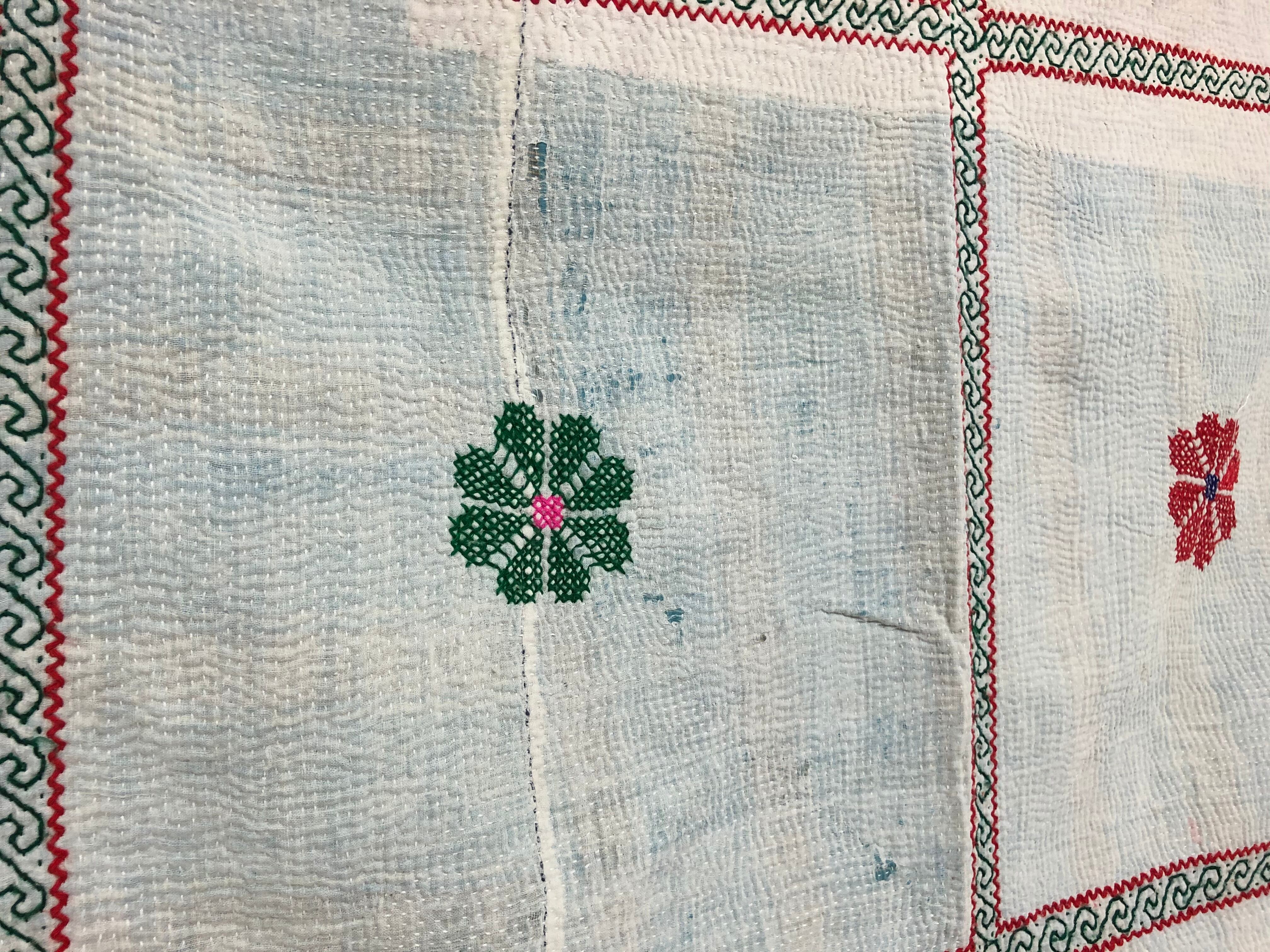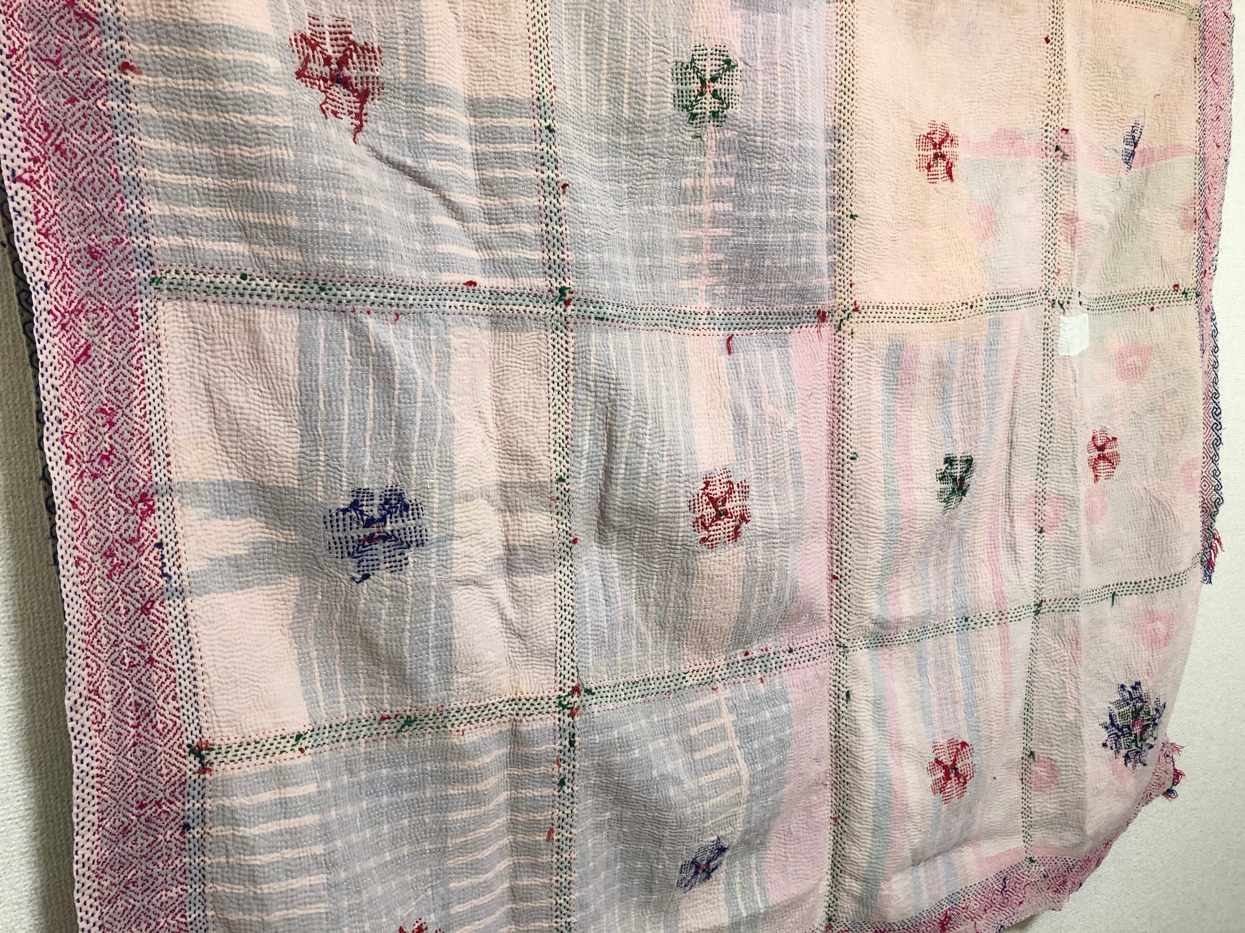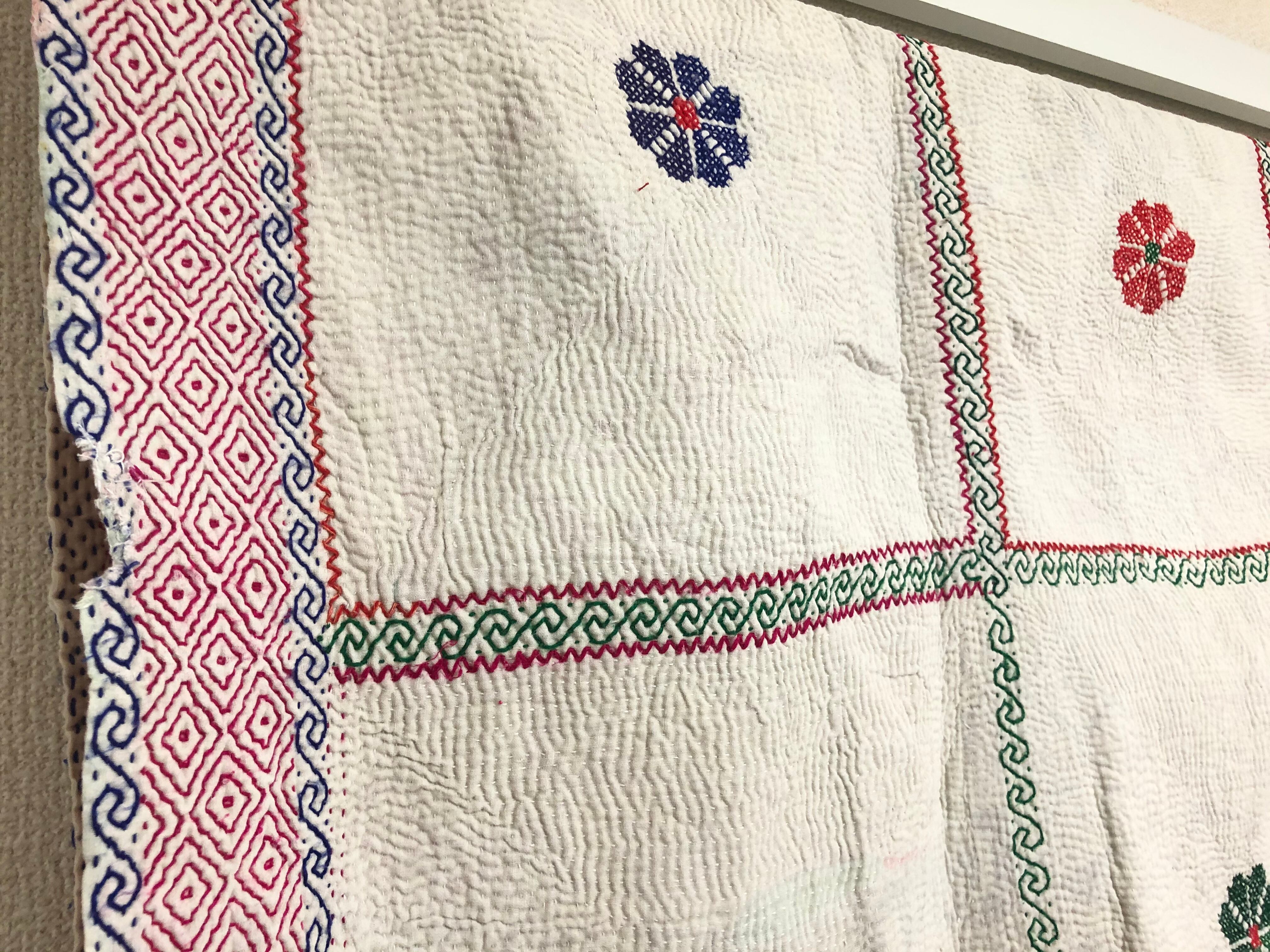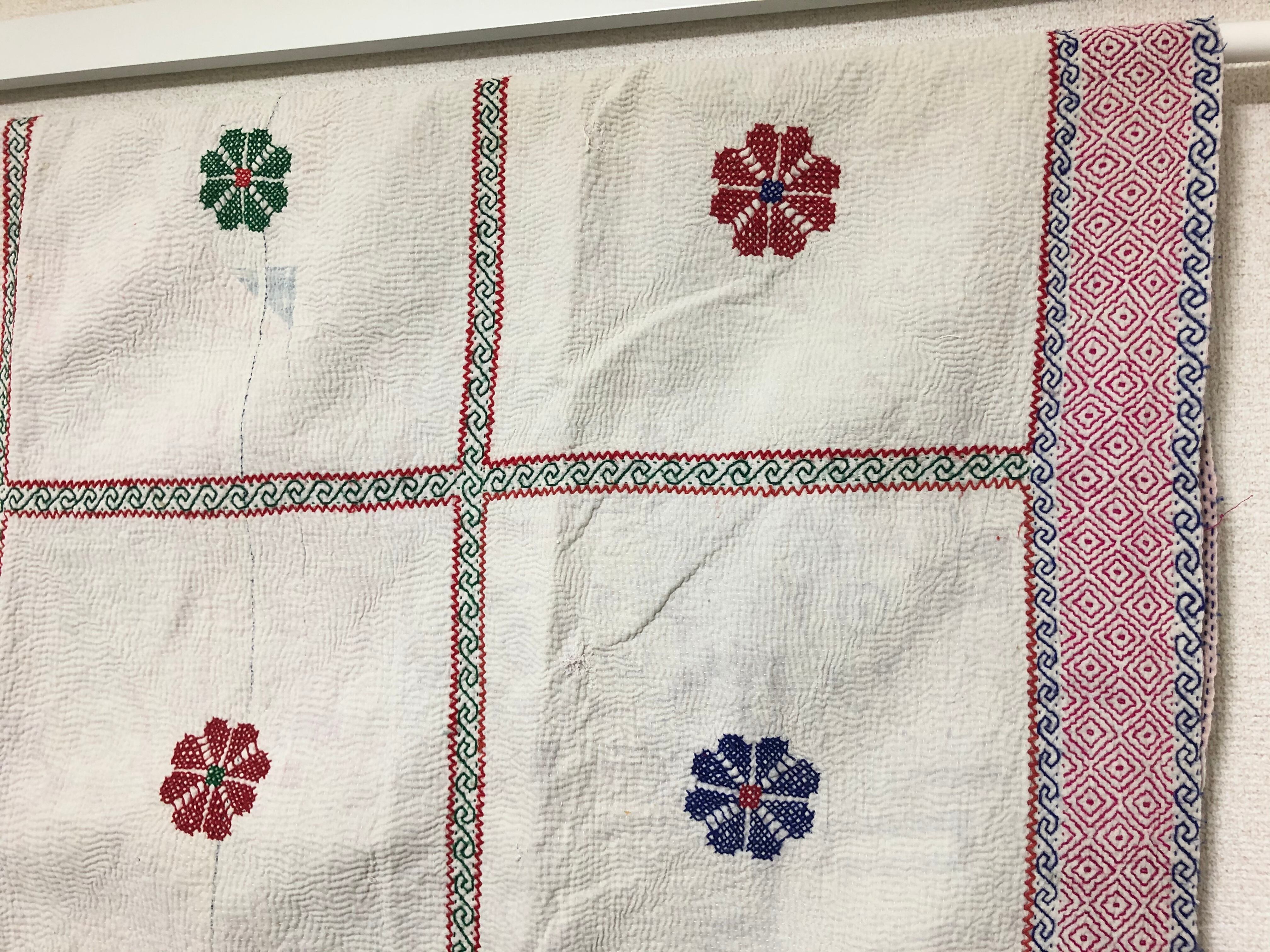 凝った刺繍の生成りラリーキルト エスニック ハンドメイド 刺し子 古布