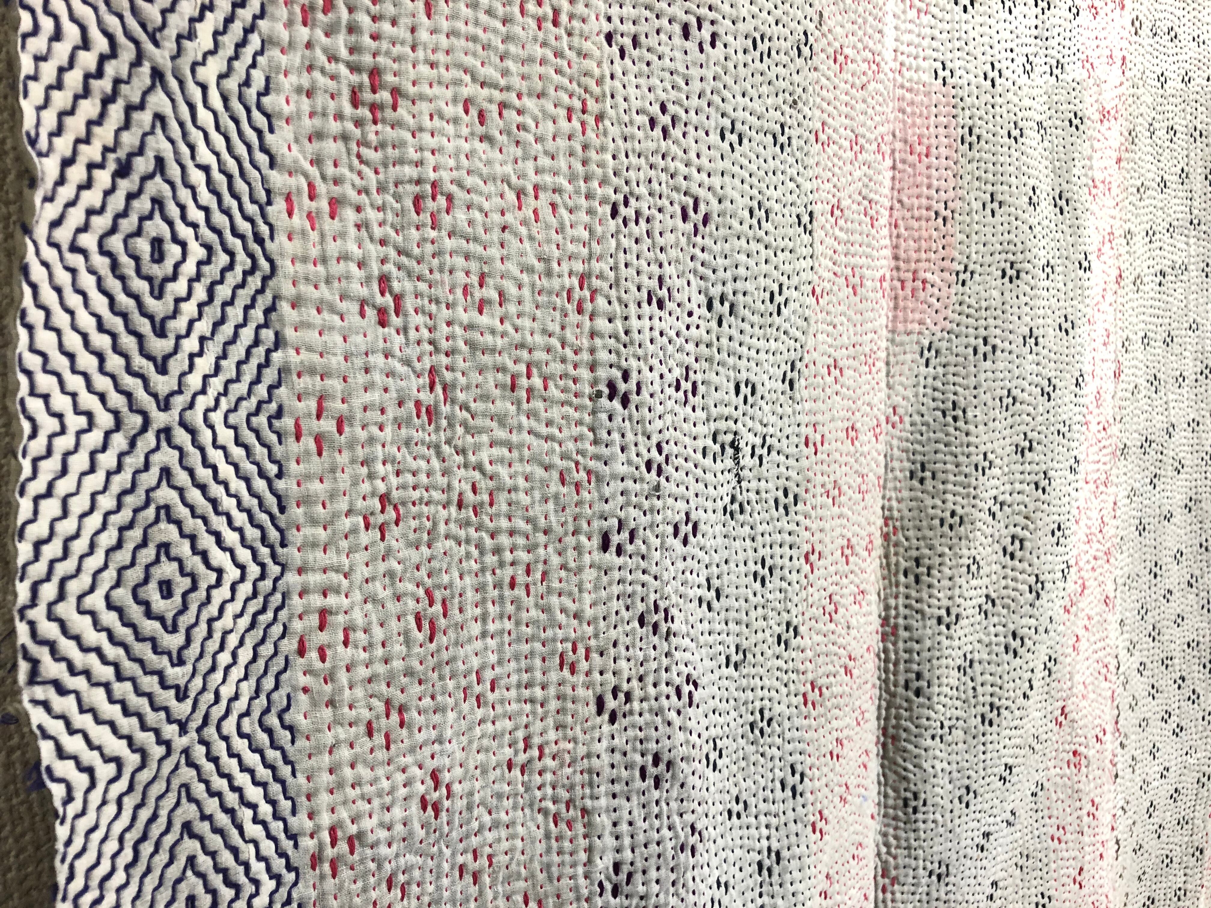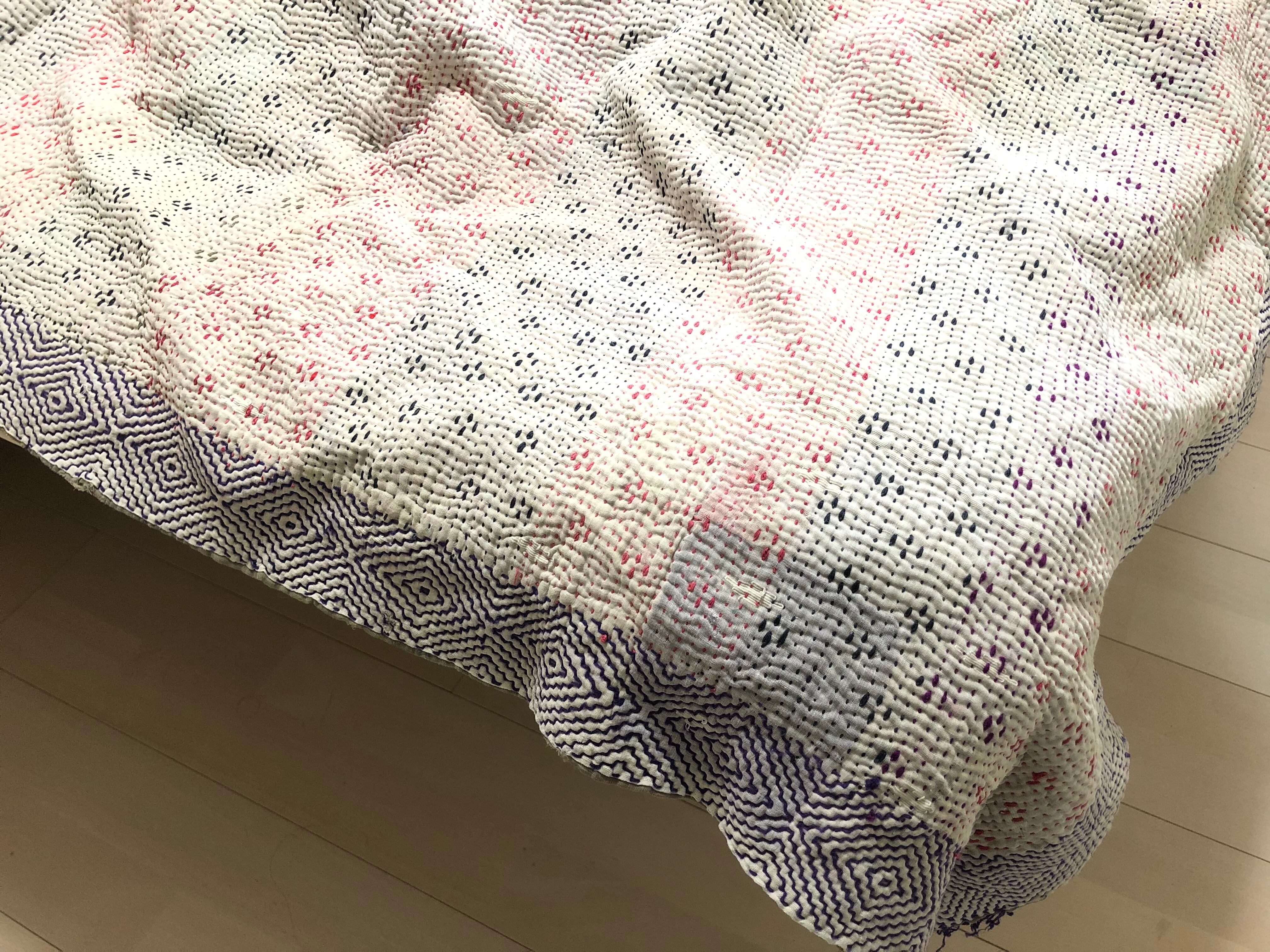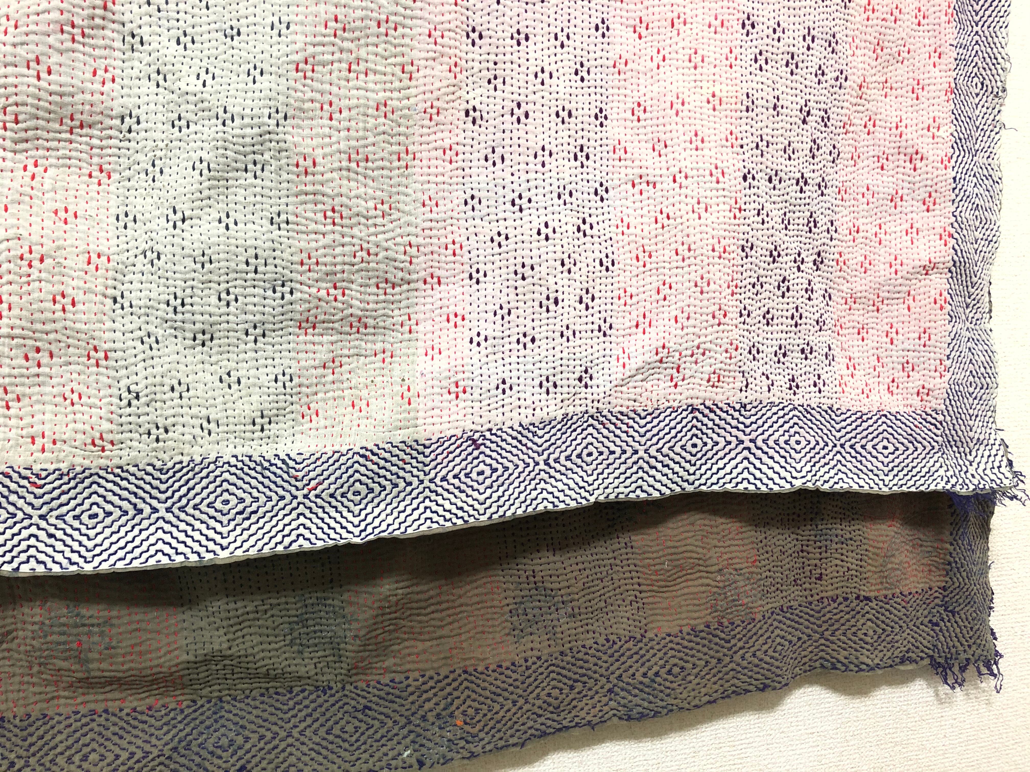 白のヴィンテージラリーキルト カンタ刺繍 刺し子 エスニック ハンドメイド パッチワーク 古布