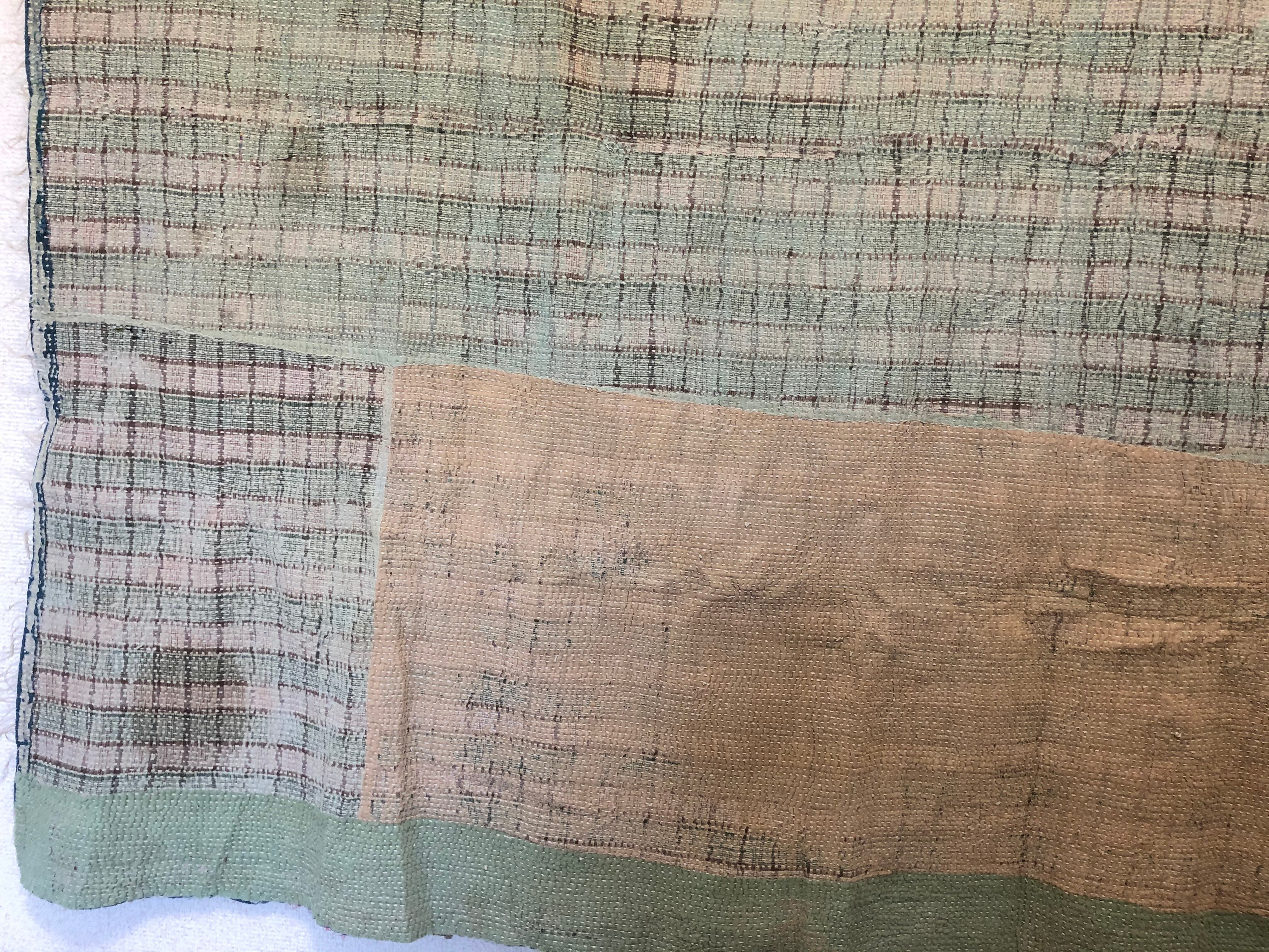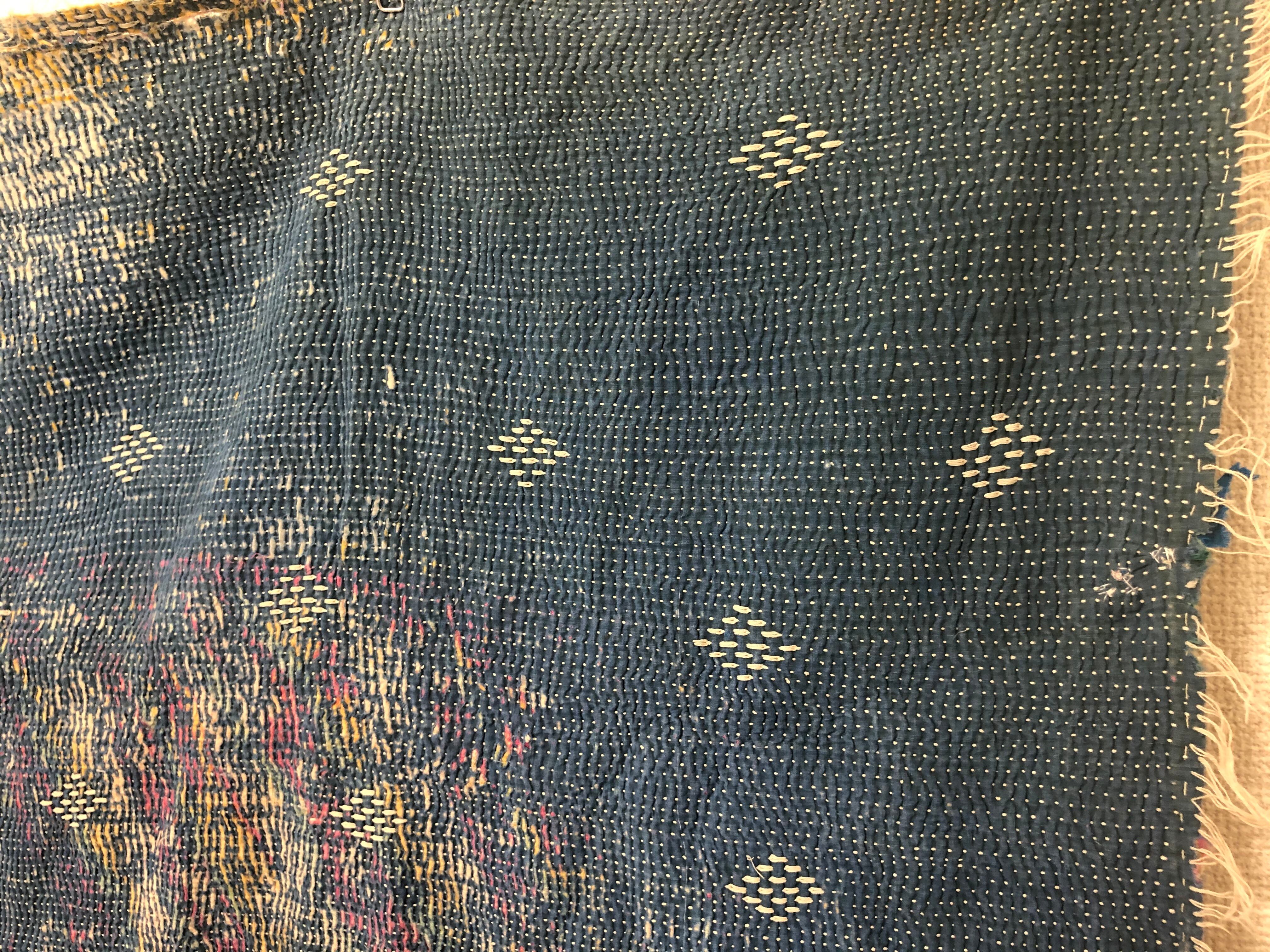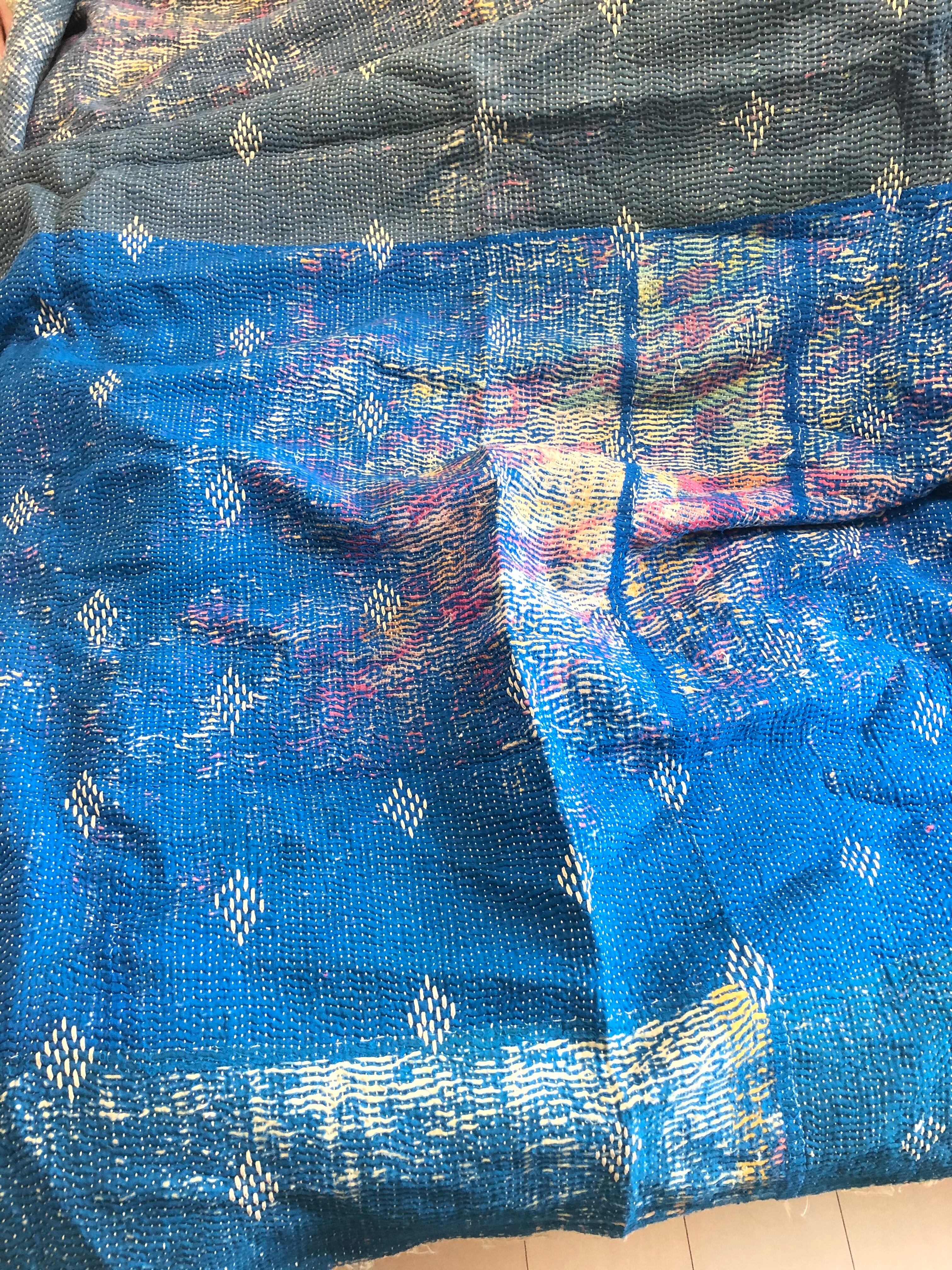 擦れて可愛いアオのヴィンテージラリーキルト カンタ刺繍 刺し子 ハンドメイド マルチカバー