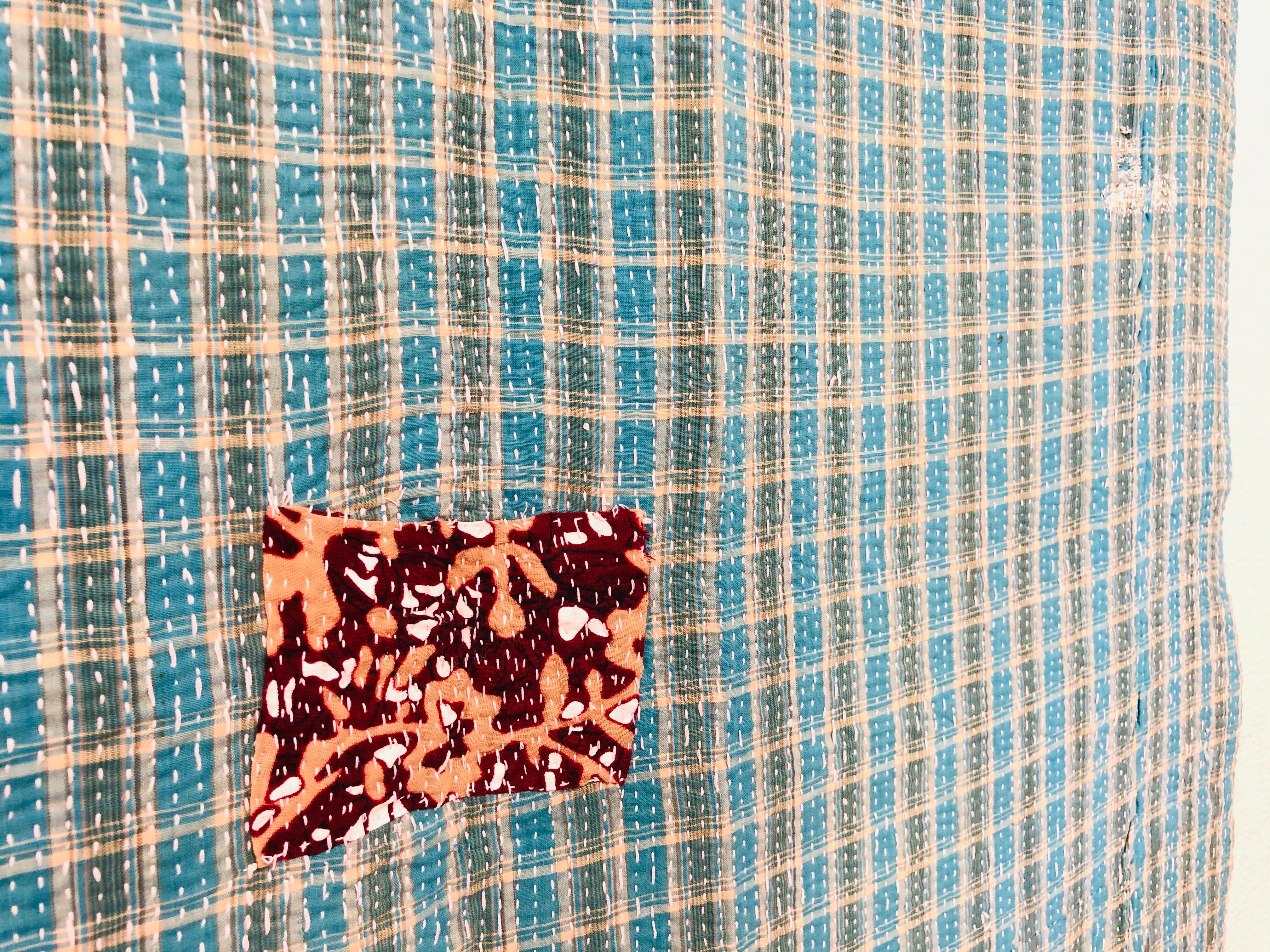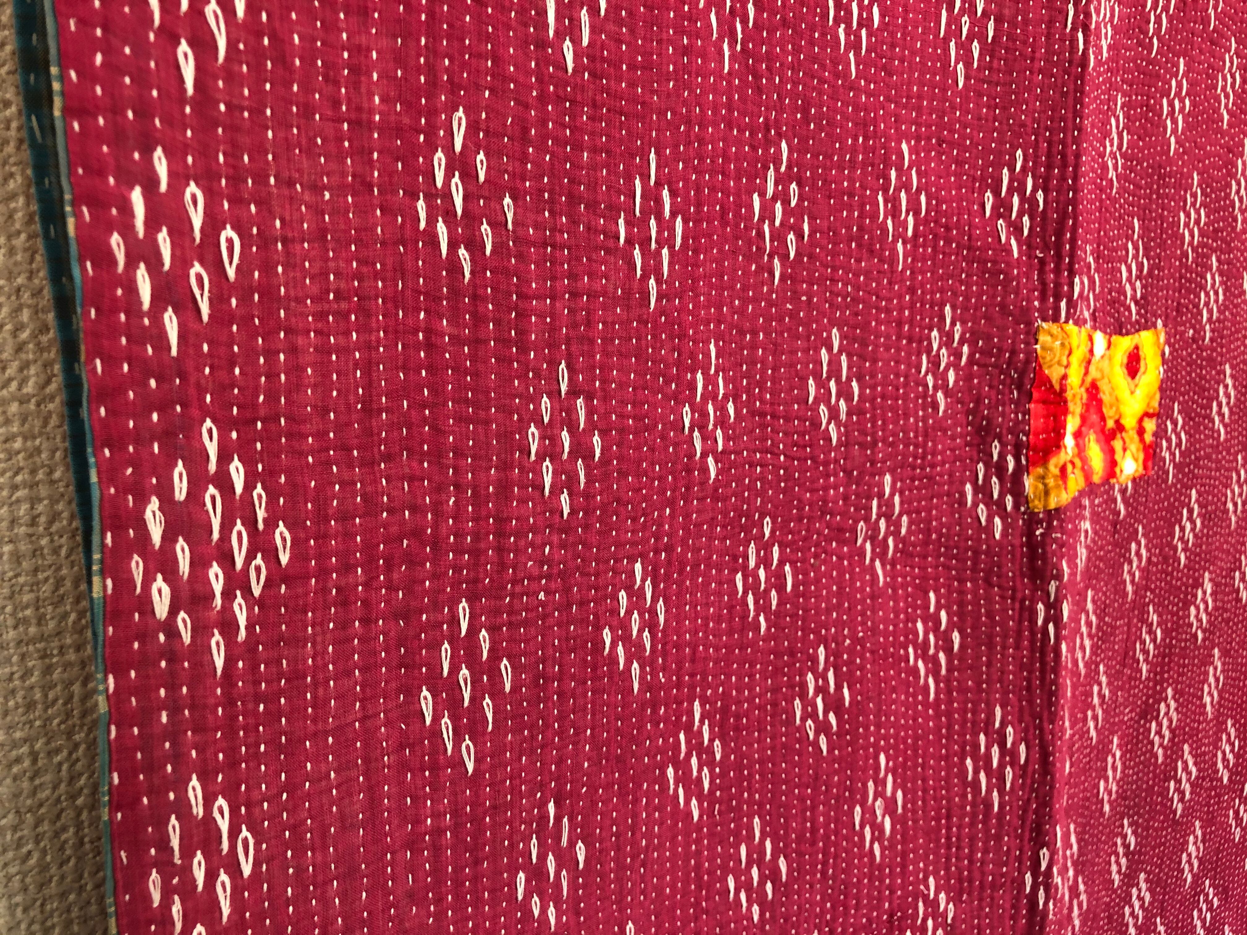 ワインレッドとミズイロチェックのラリーキルト カンタ刺繍 刺し子 エスニック ハンドメイド リメイク パッチワーク