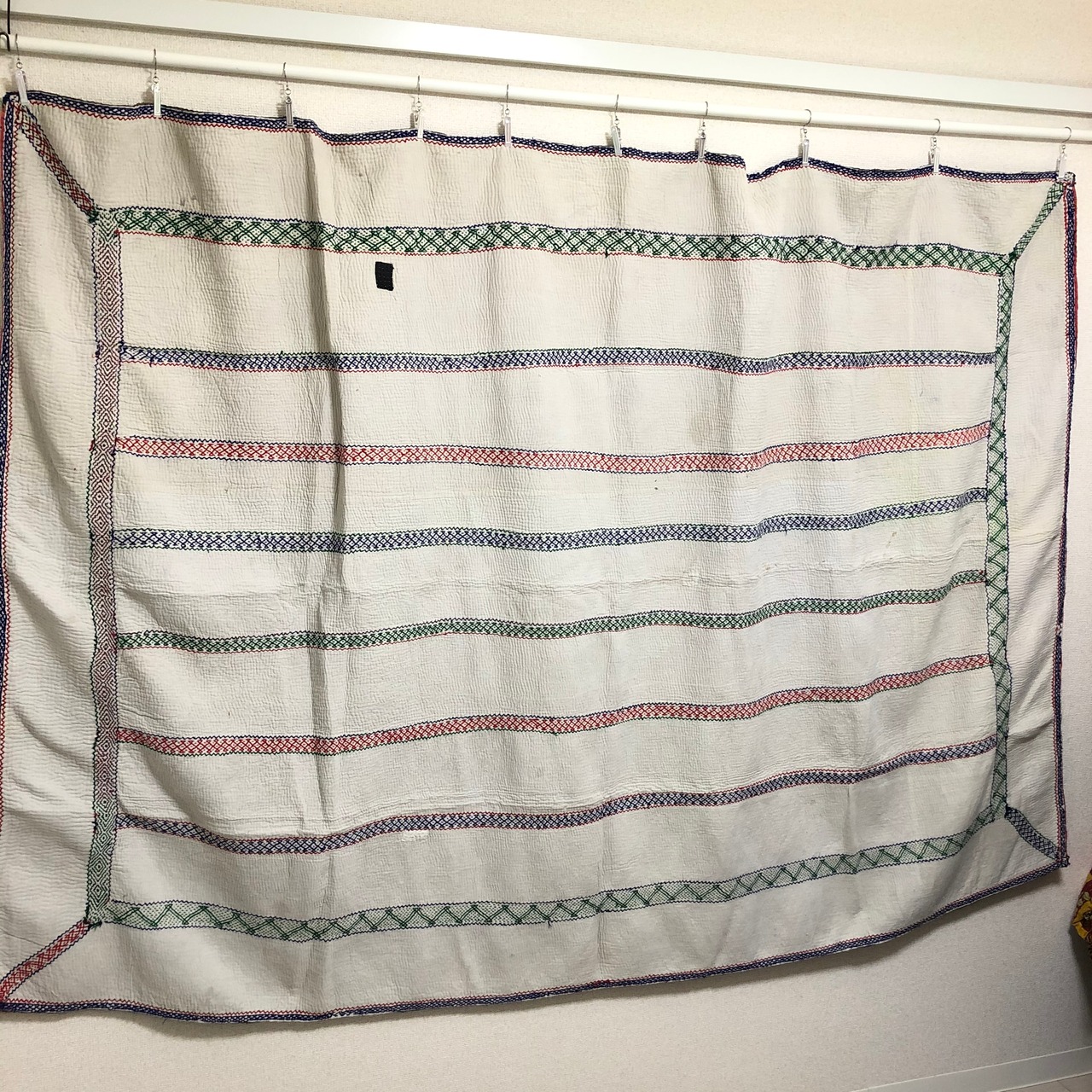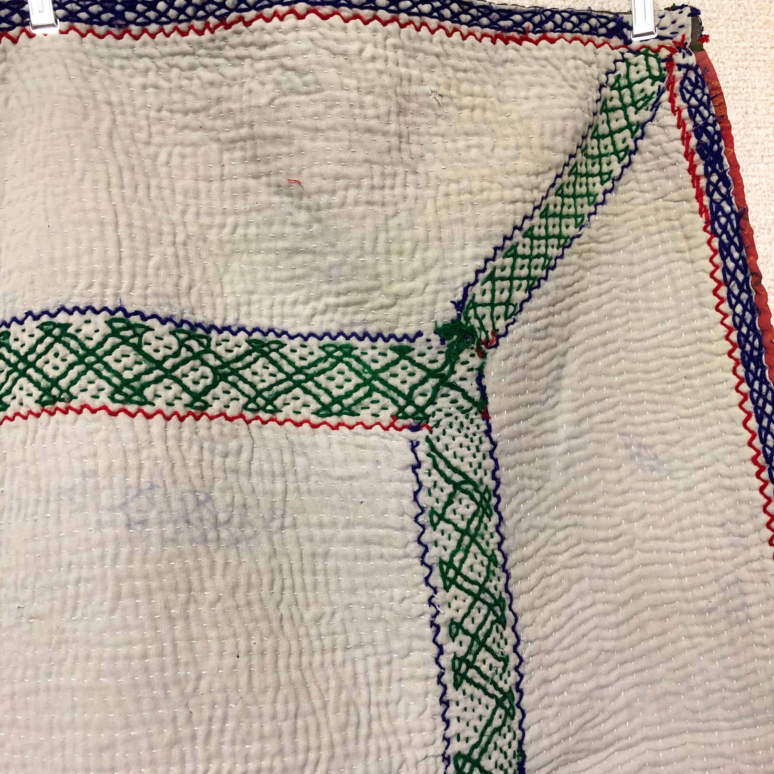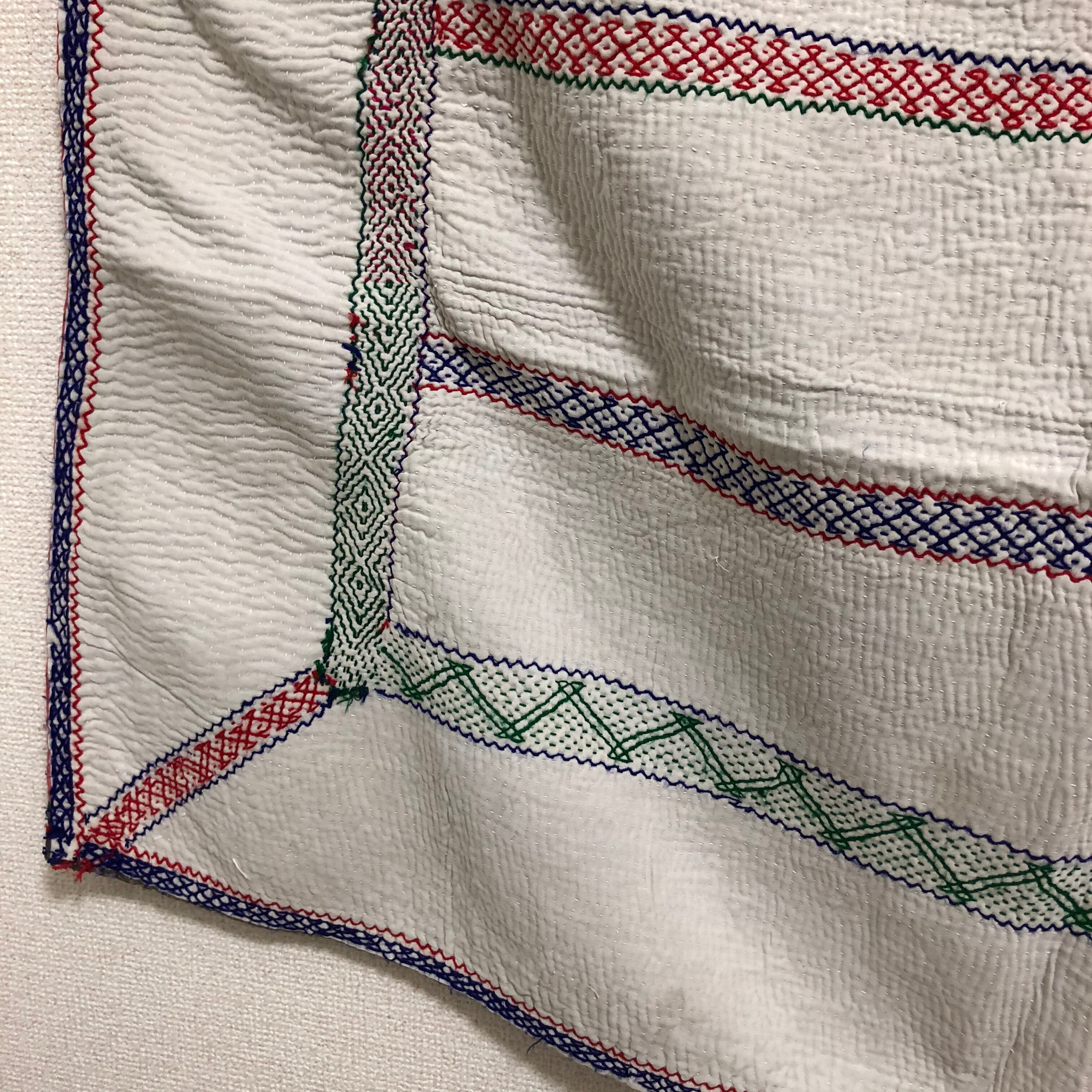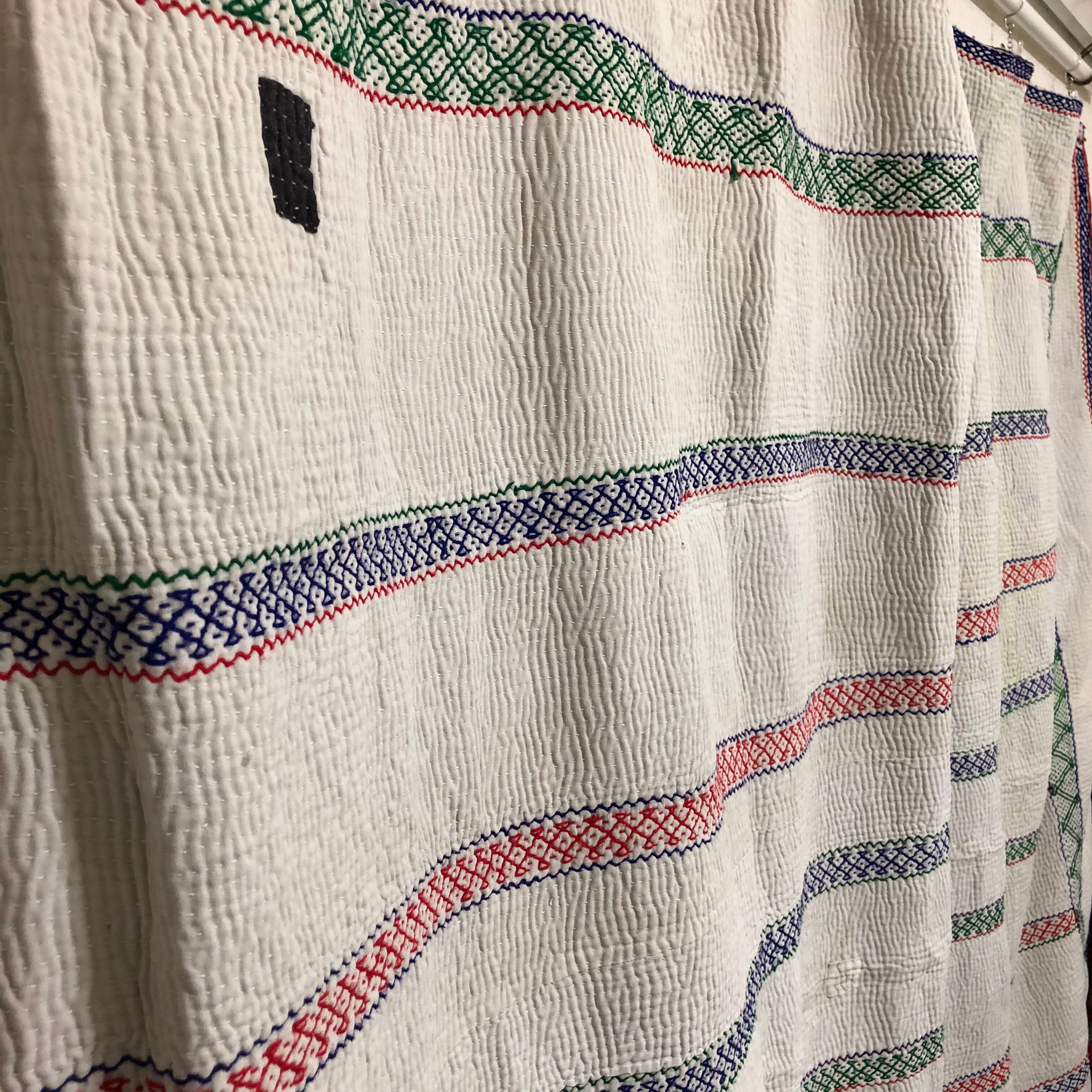 刺繍が凝ってる生成りのラリーキルト カンタ エスニック ハンドメイド パッチワーク