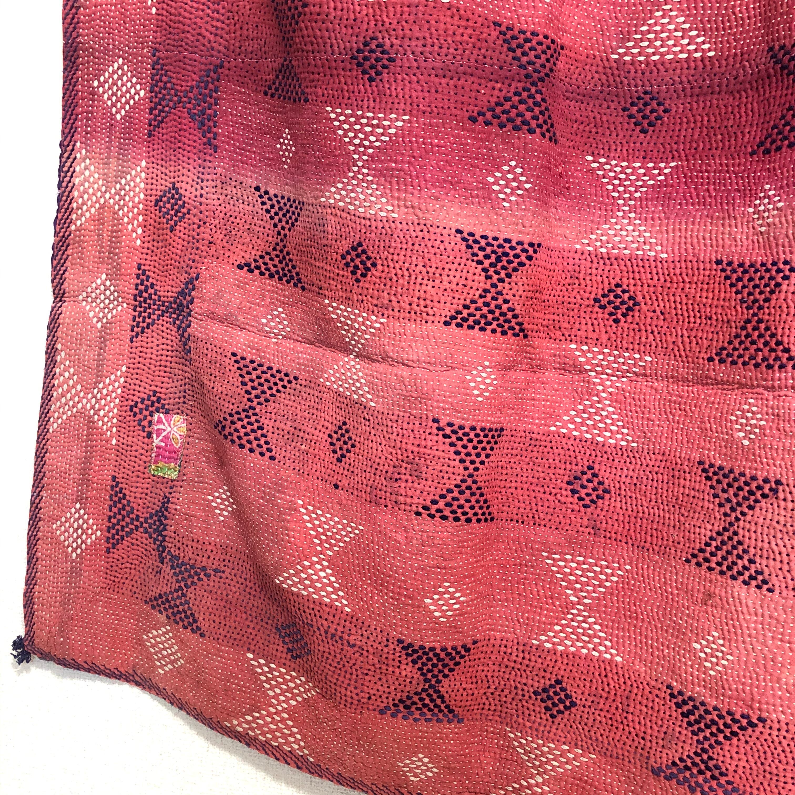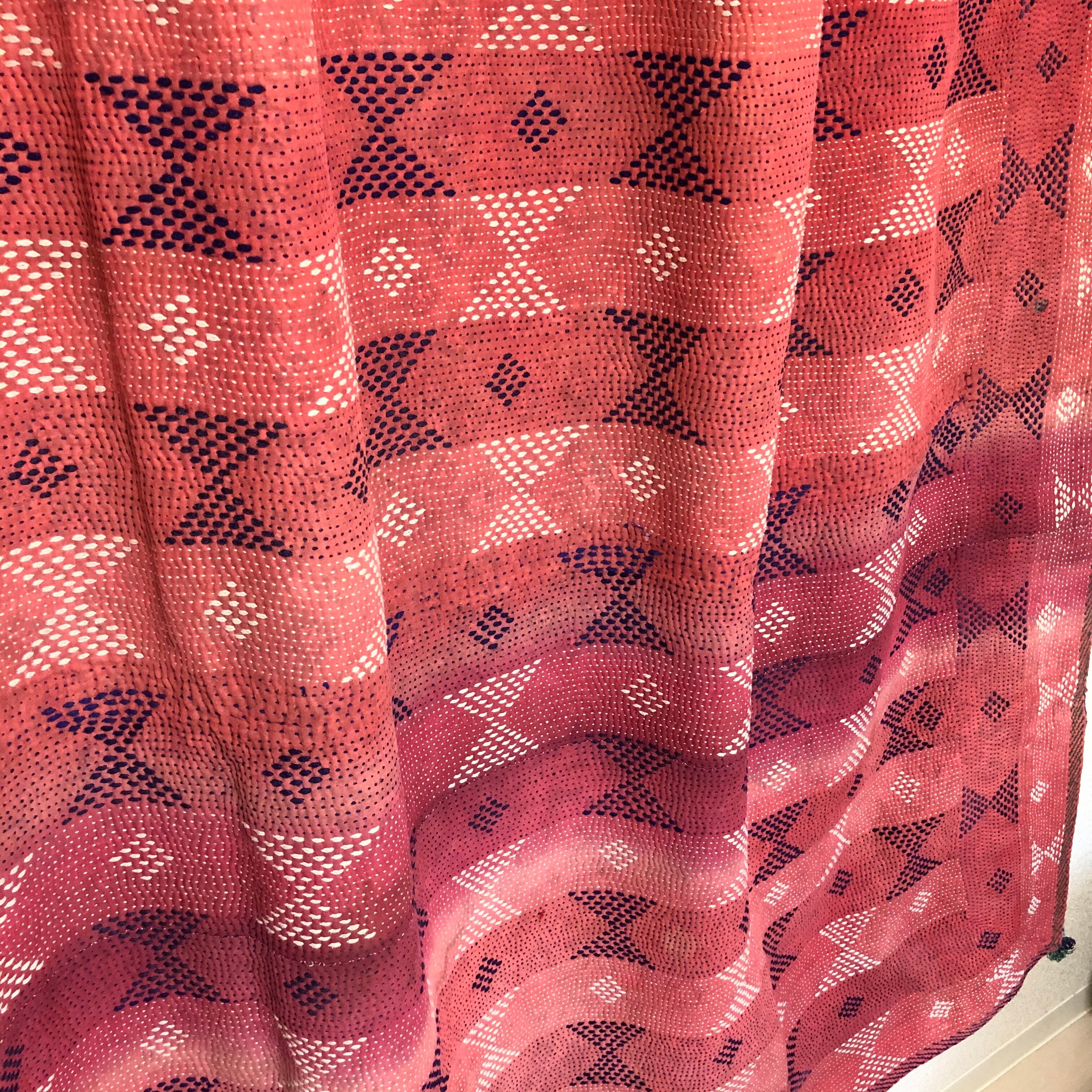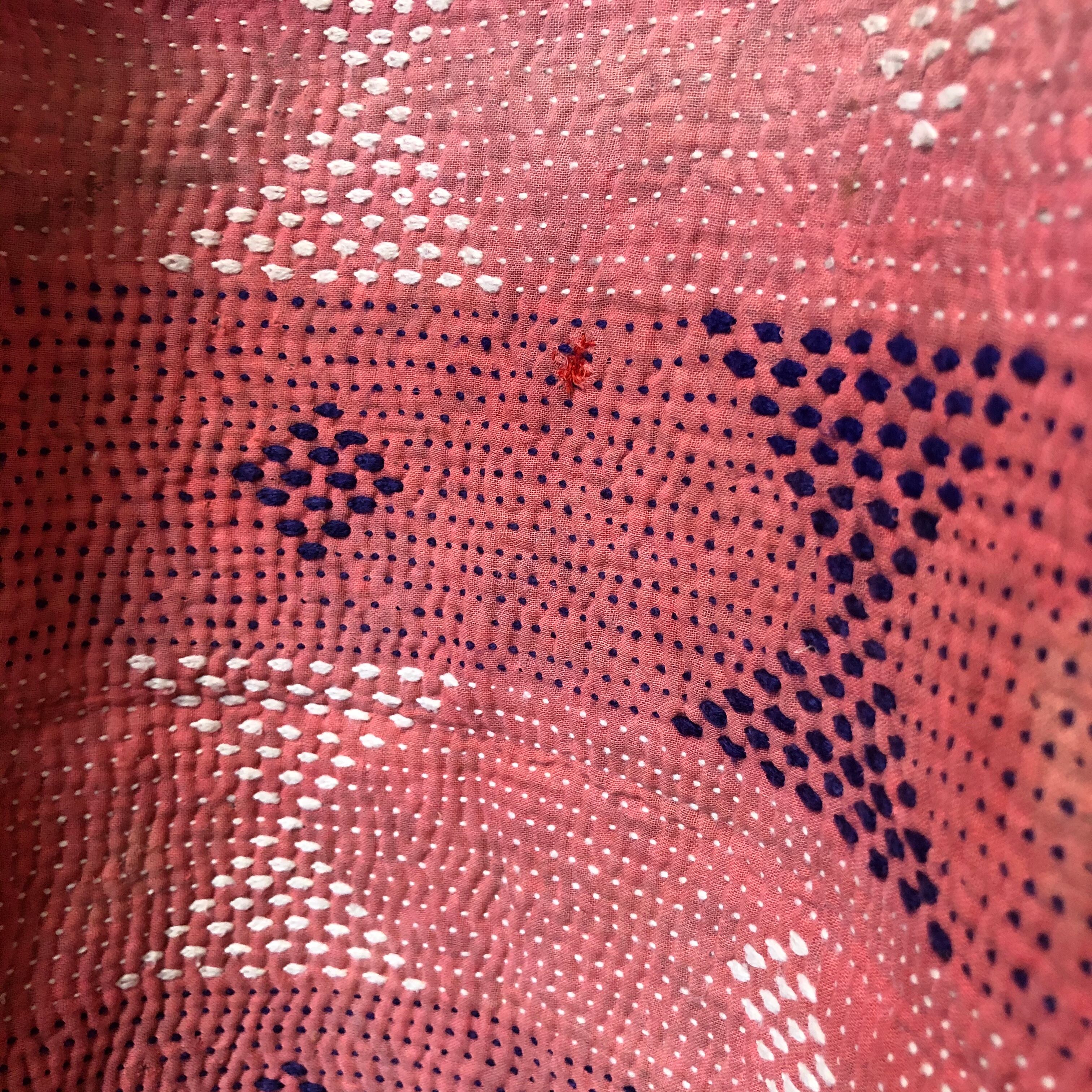 サーモンピンクにリボン型刺繍が可愛いラリーキルト 刺し子 カンタ エスニック ハンドメイド