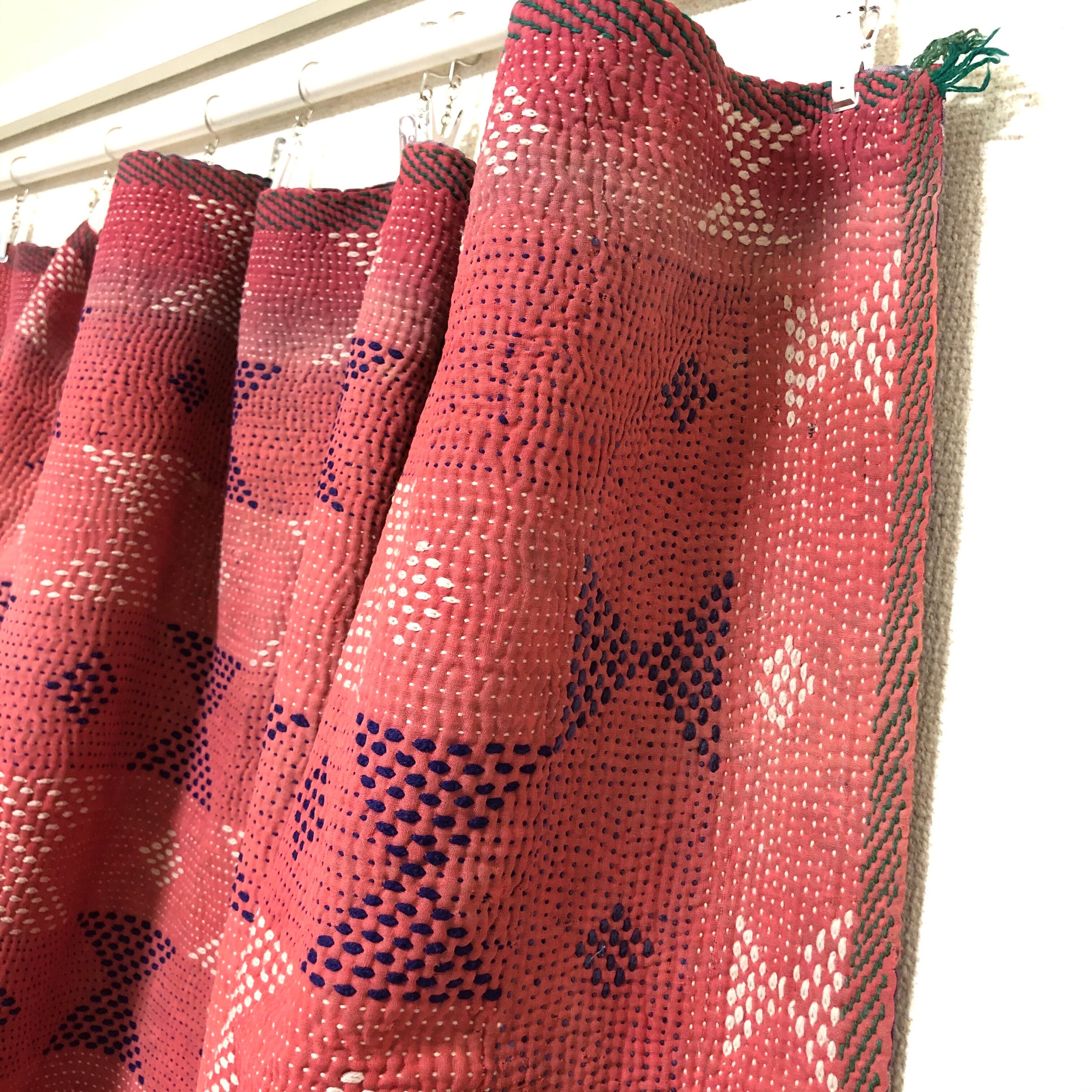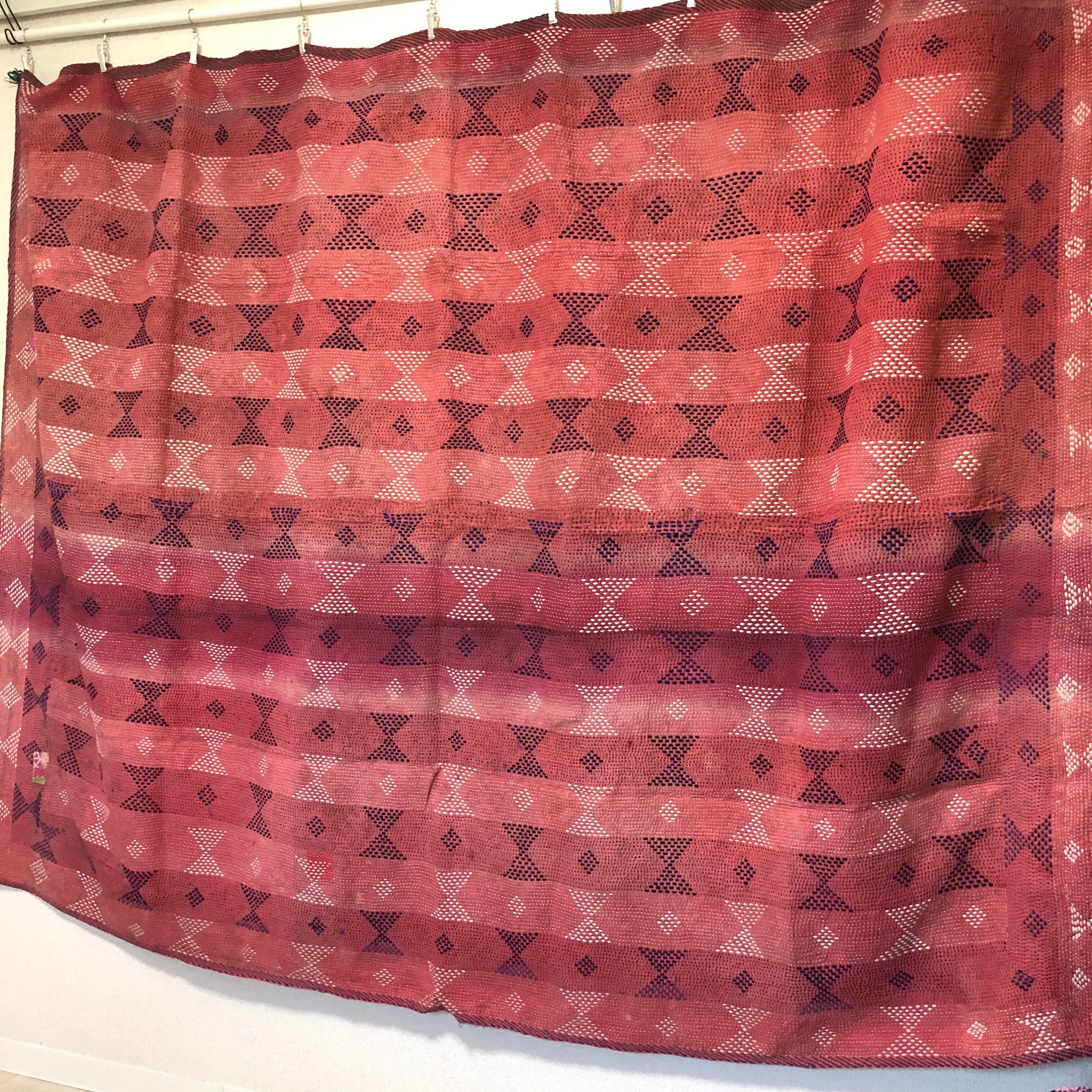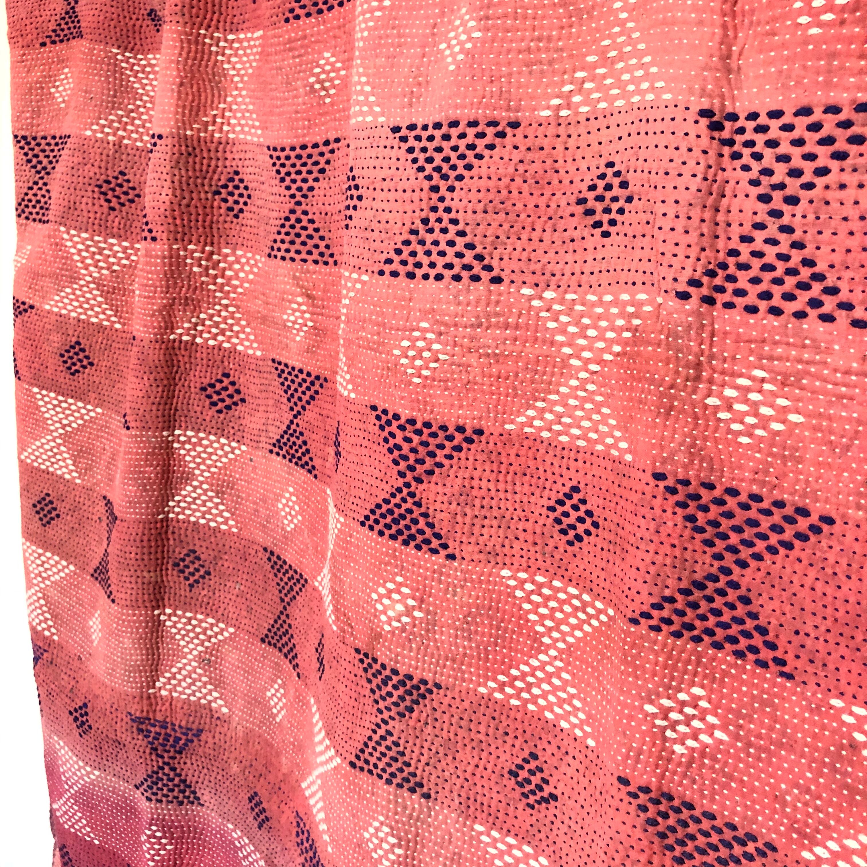 サーモンピンクにリボン型刺繍が可愛いラリーキルト 刺し子 カンタ エスニック ハンドメイド