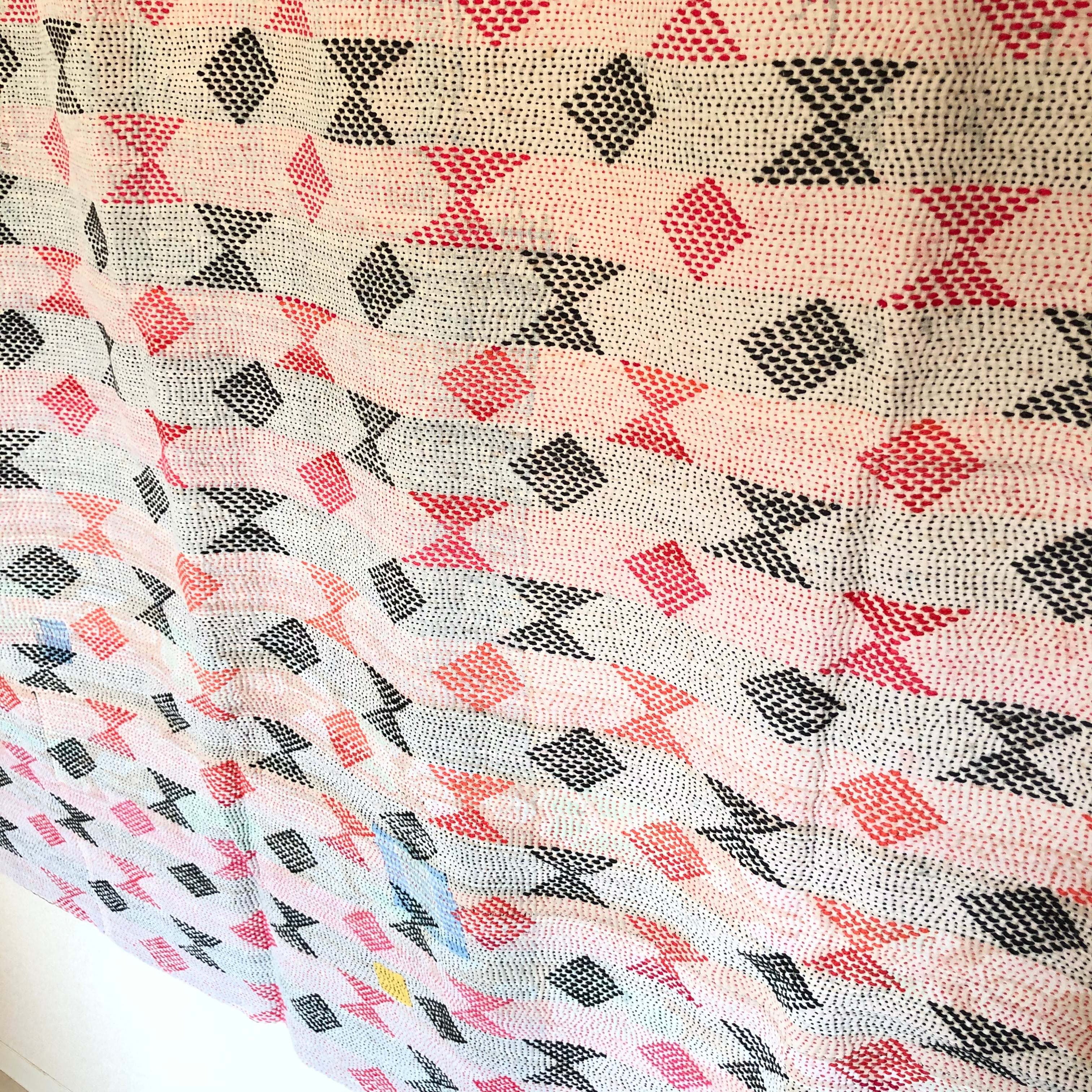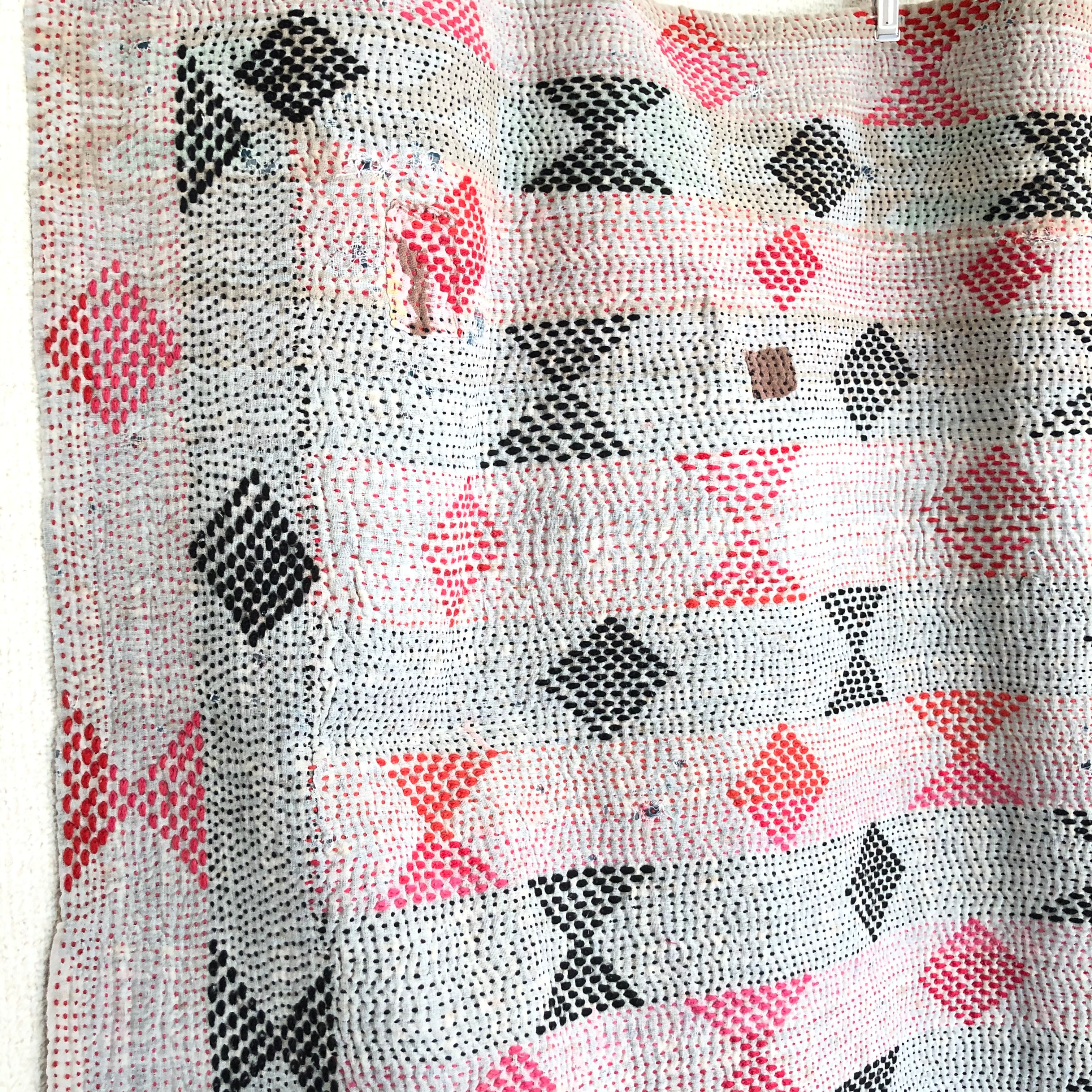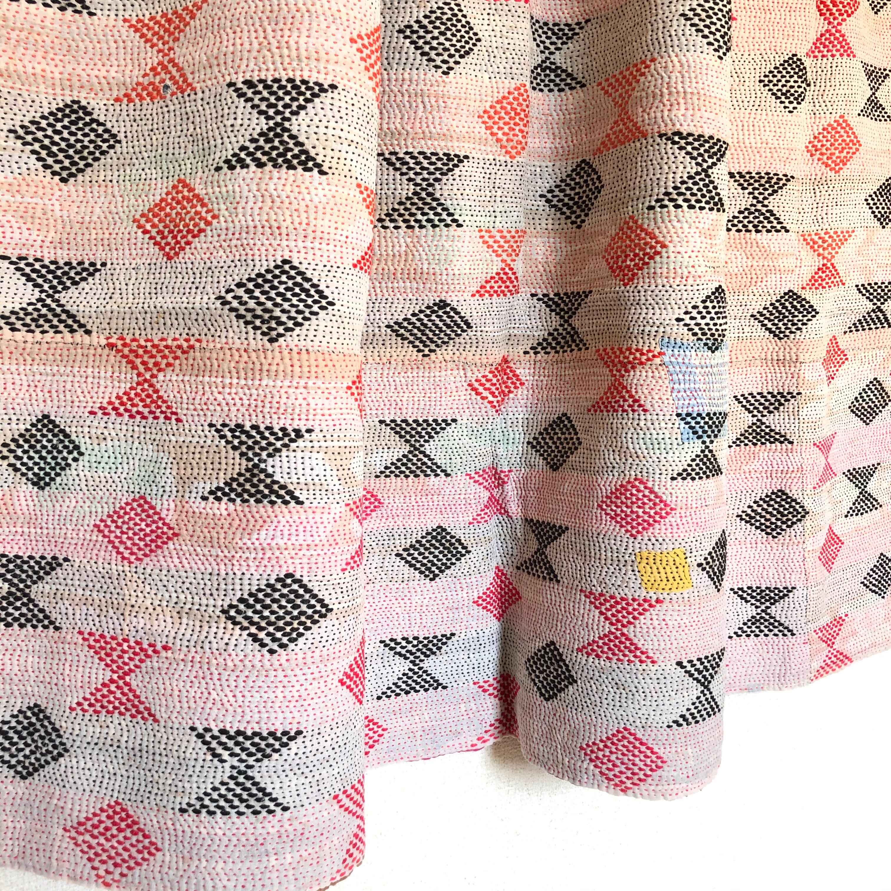 ダイヤとリボン刺繍のラリーキルト 刺し子 エスニック ハンドメイド インド綿 グドゥリ 古布