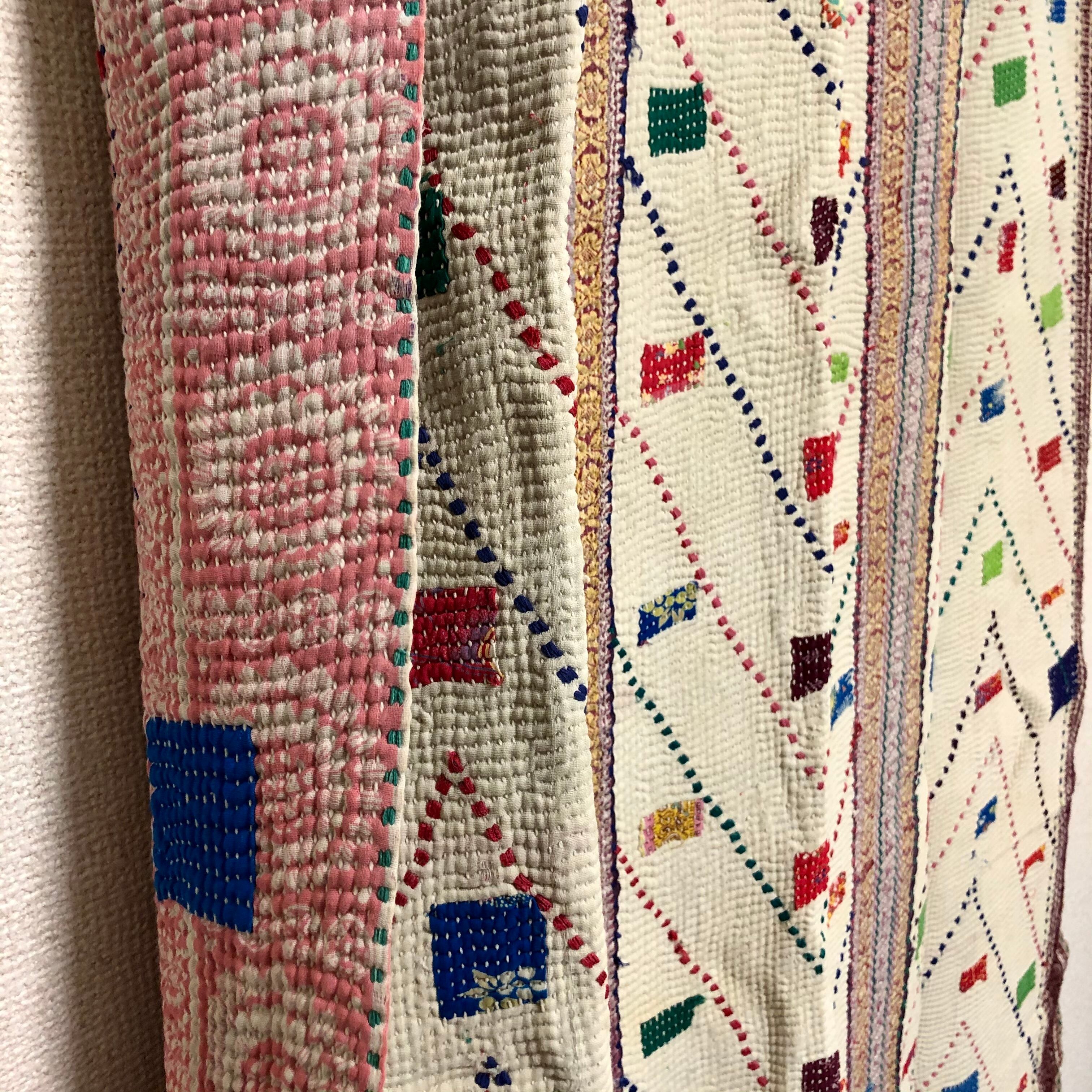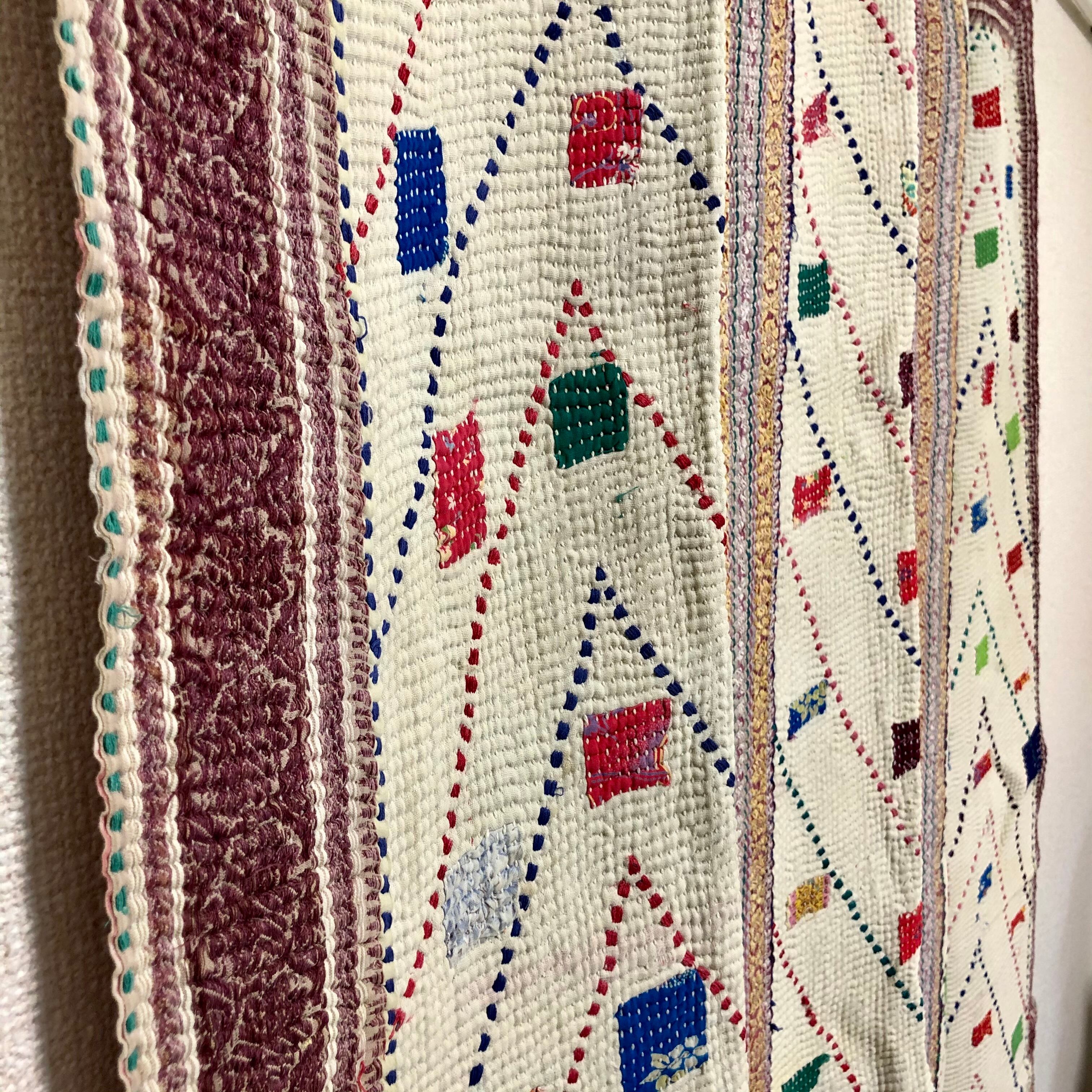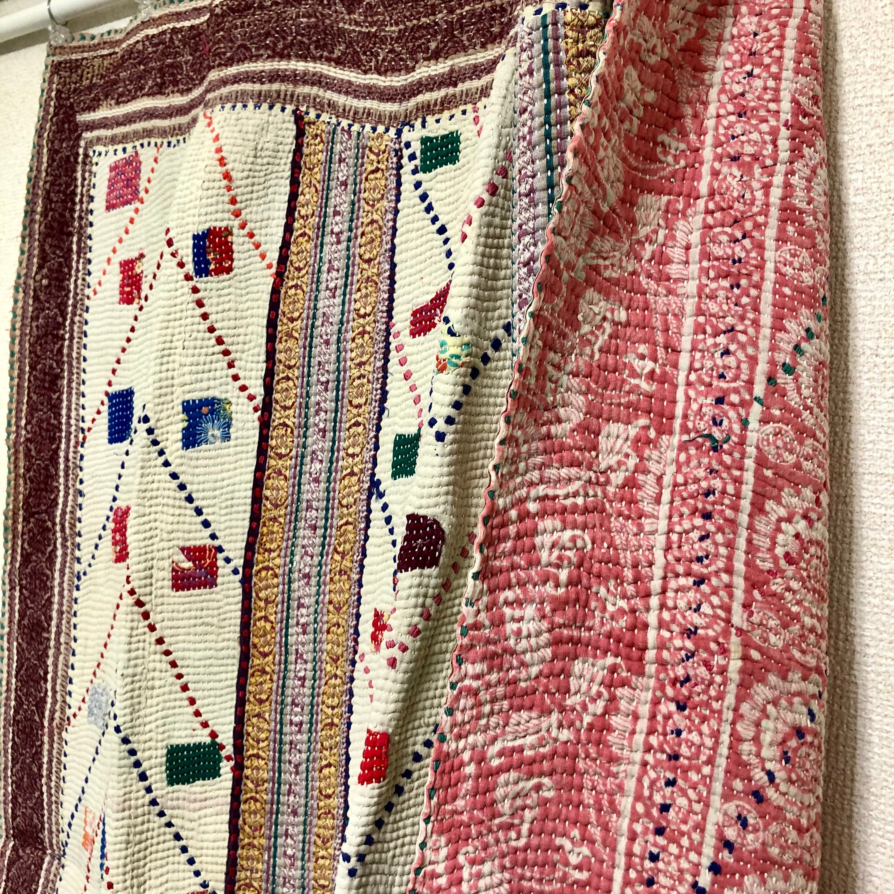 リボンテープと当て布が可愛い小さめラリーキルト 刺し子 リメイク インド綿 古布
