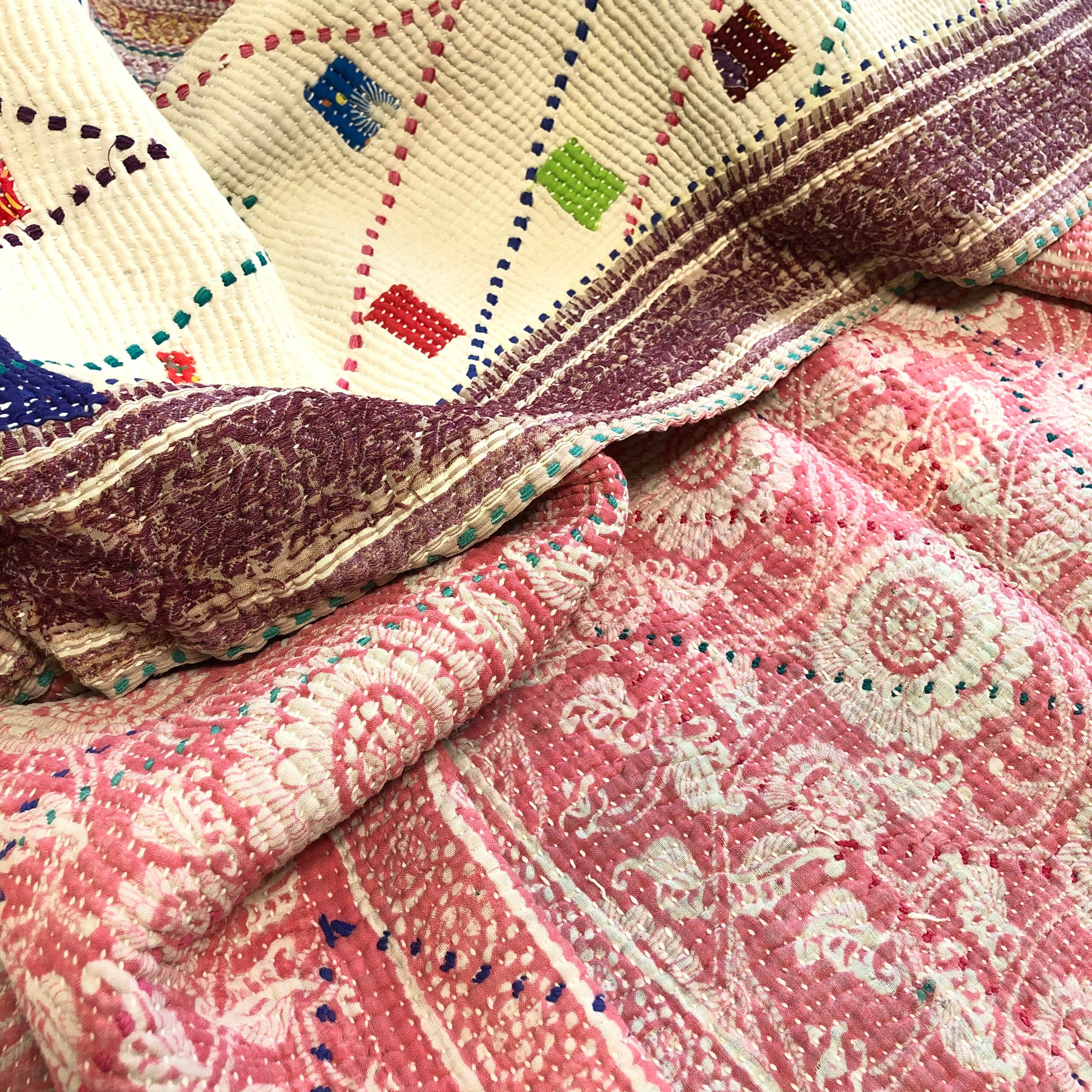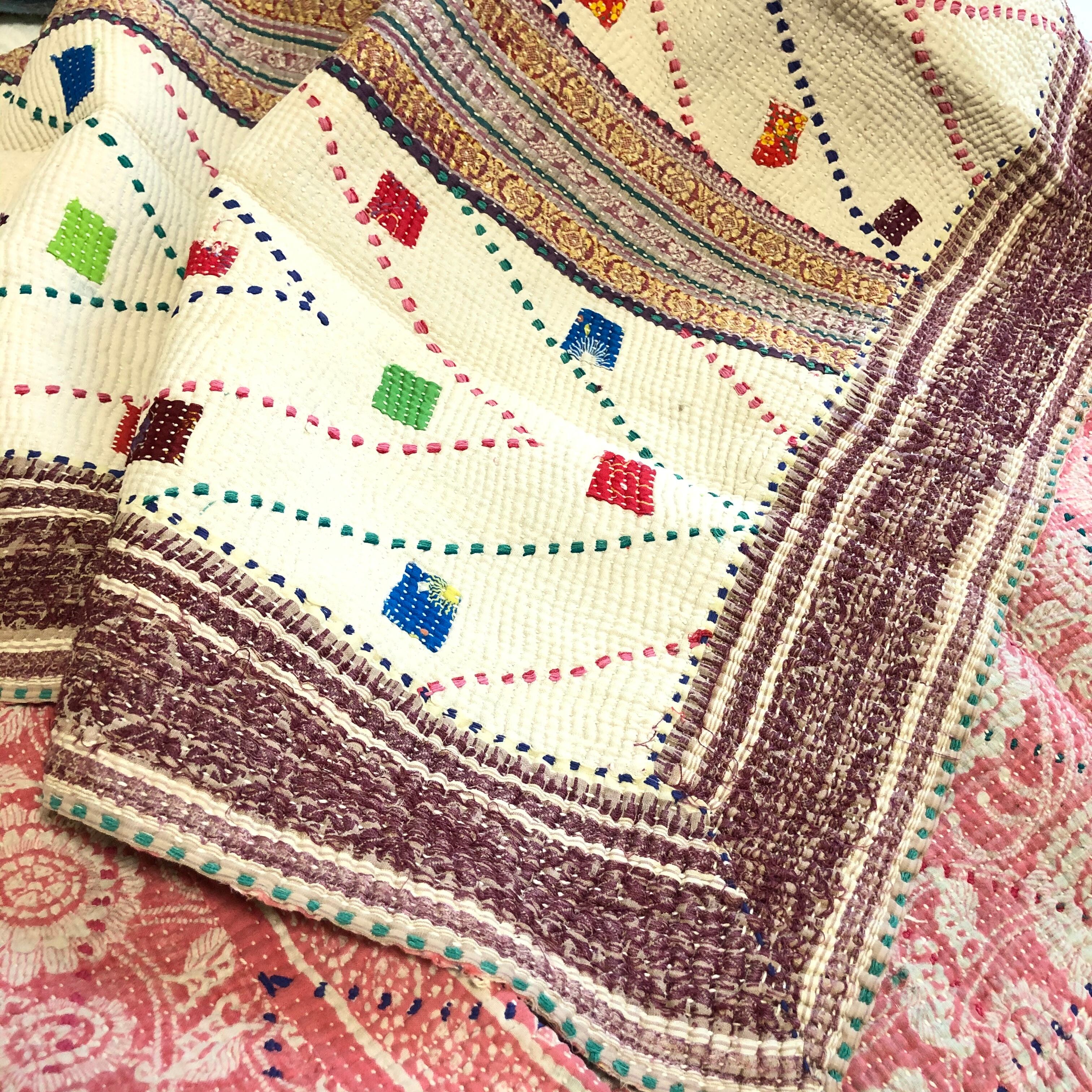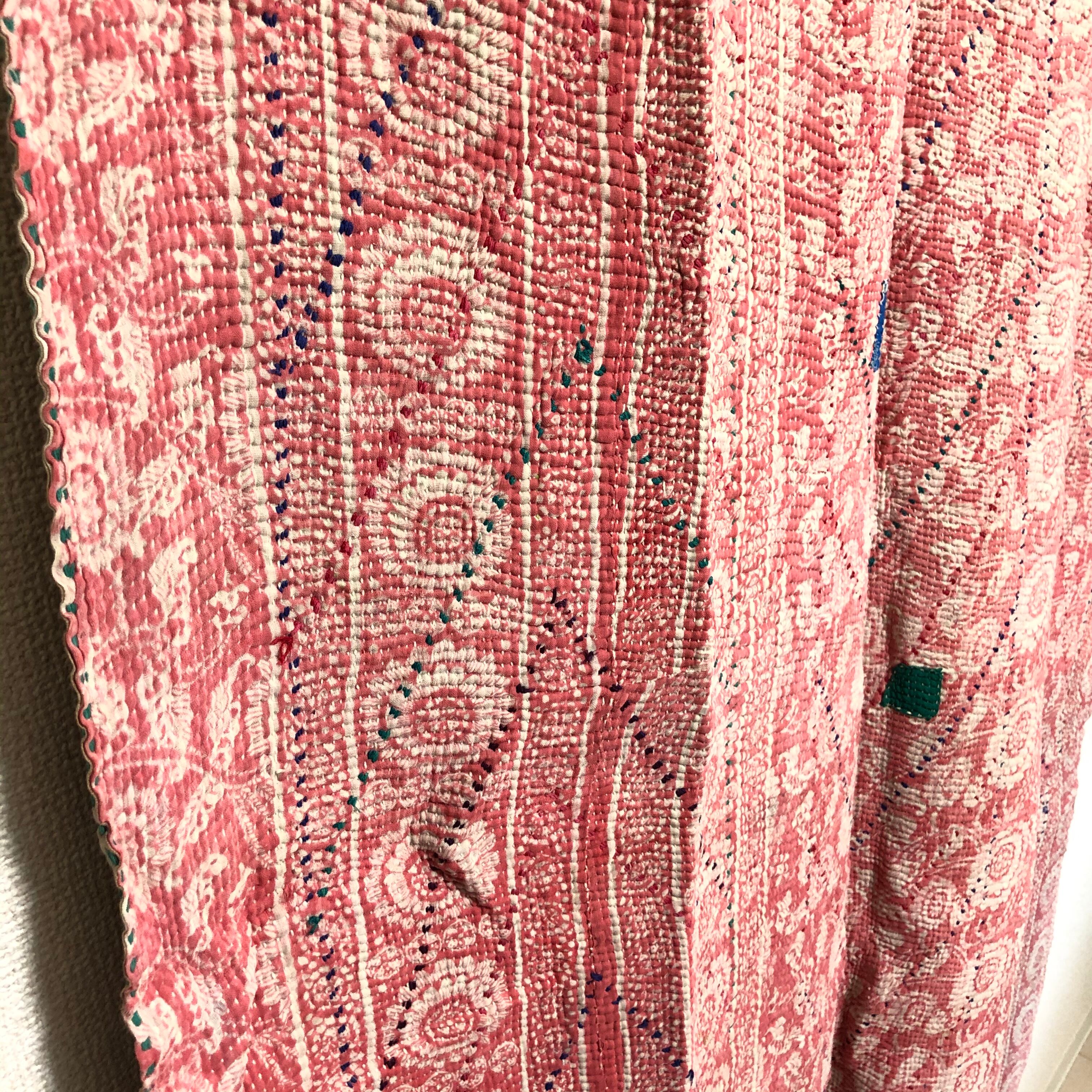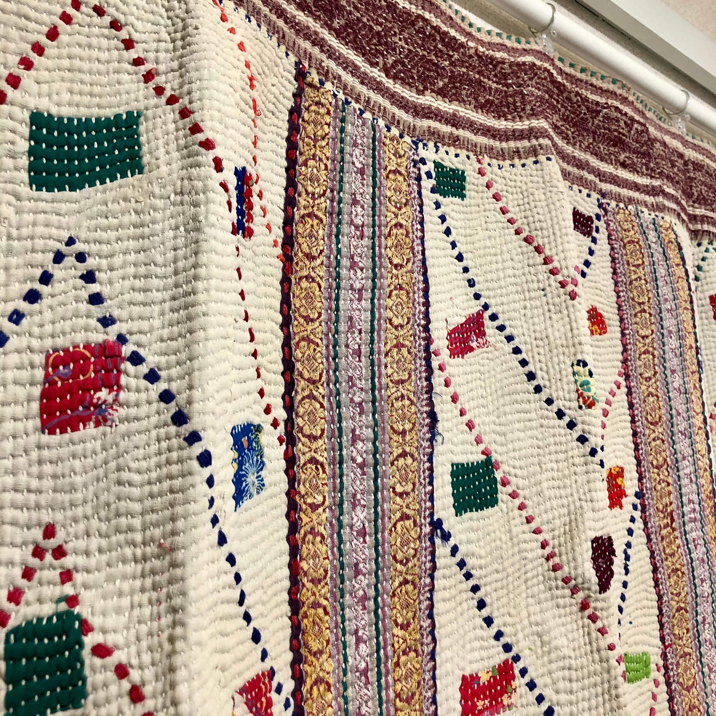 リボンテープと当て布が可愛い小さめラリーキルト 刺し子 リメイク インド綿 古布