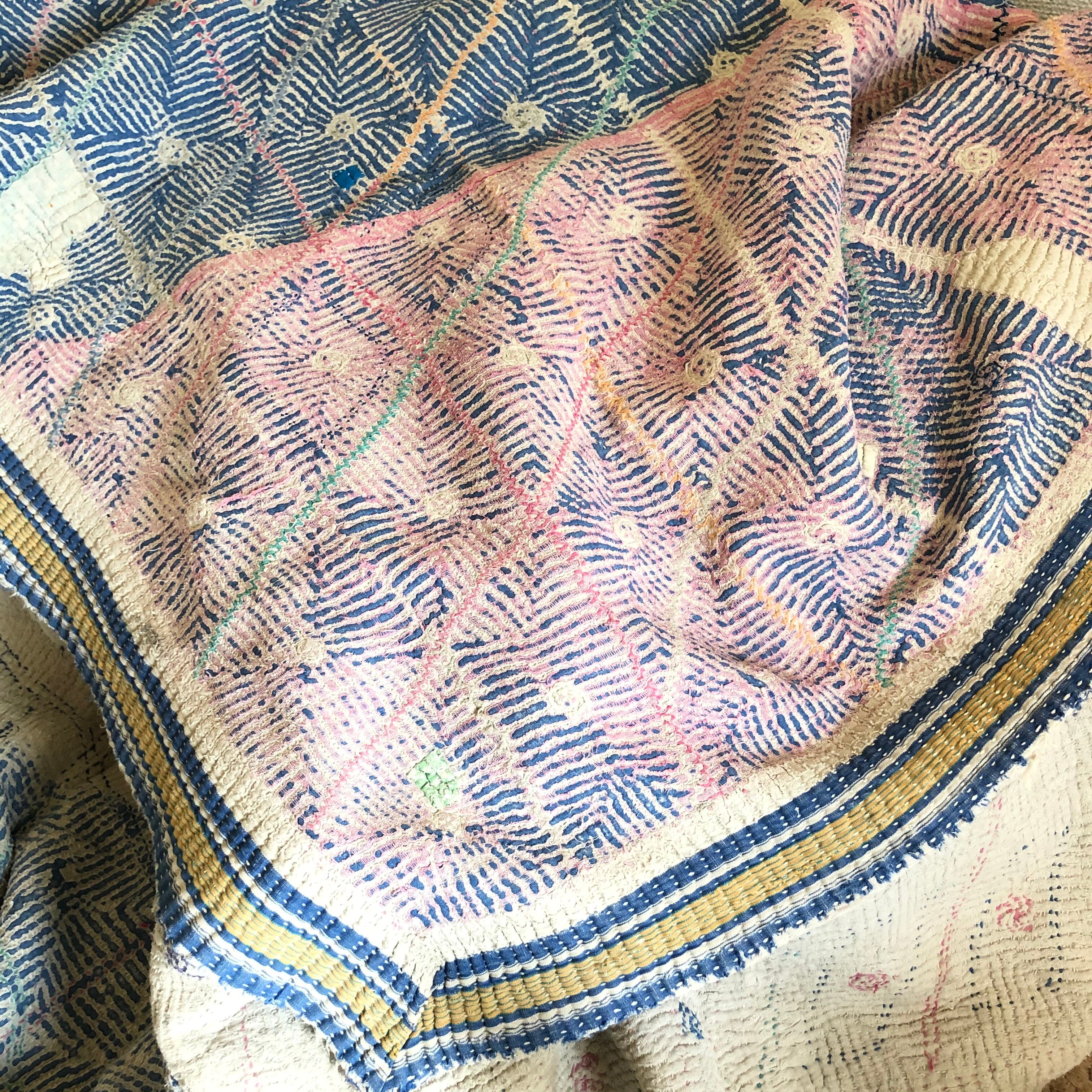 ヴィンテージラリーキルト #103 ピンクとアオの刺繍 エスニック 刺し子 襤褸