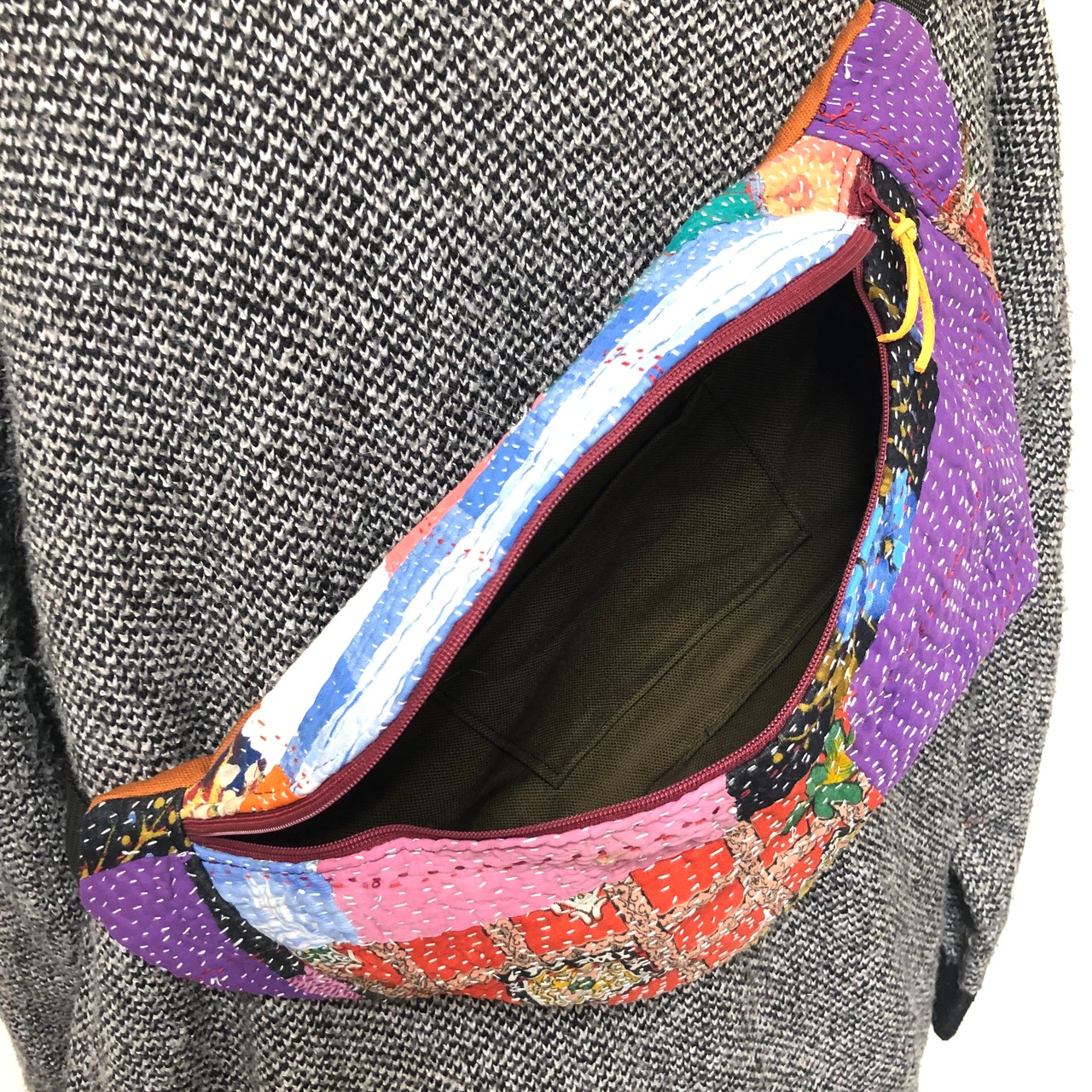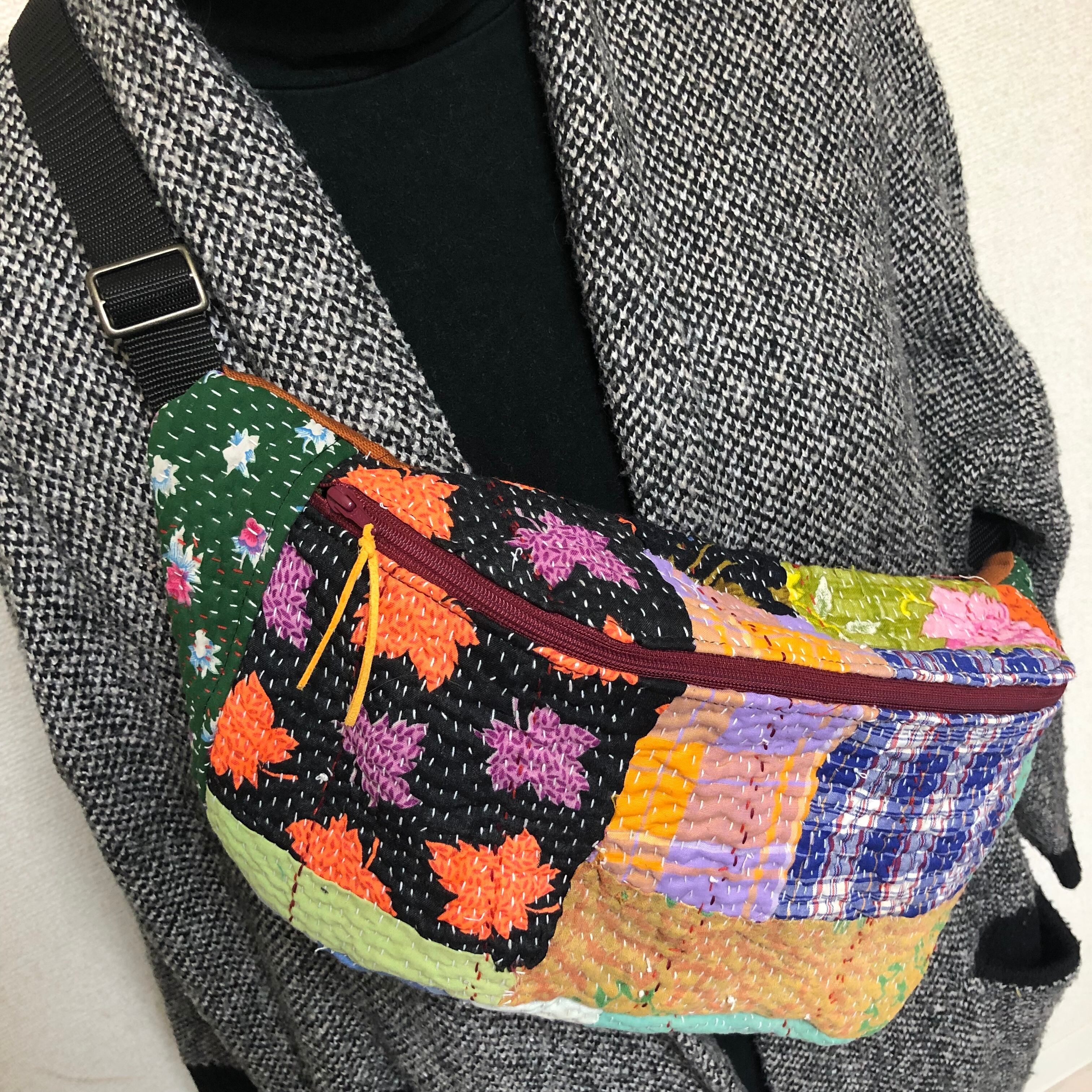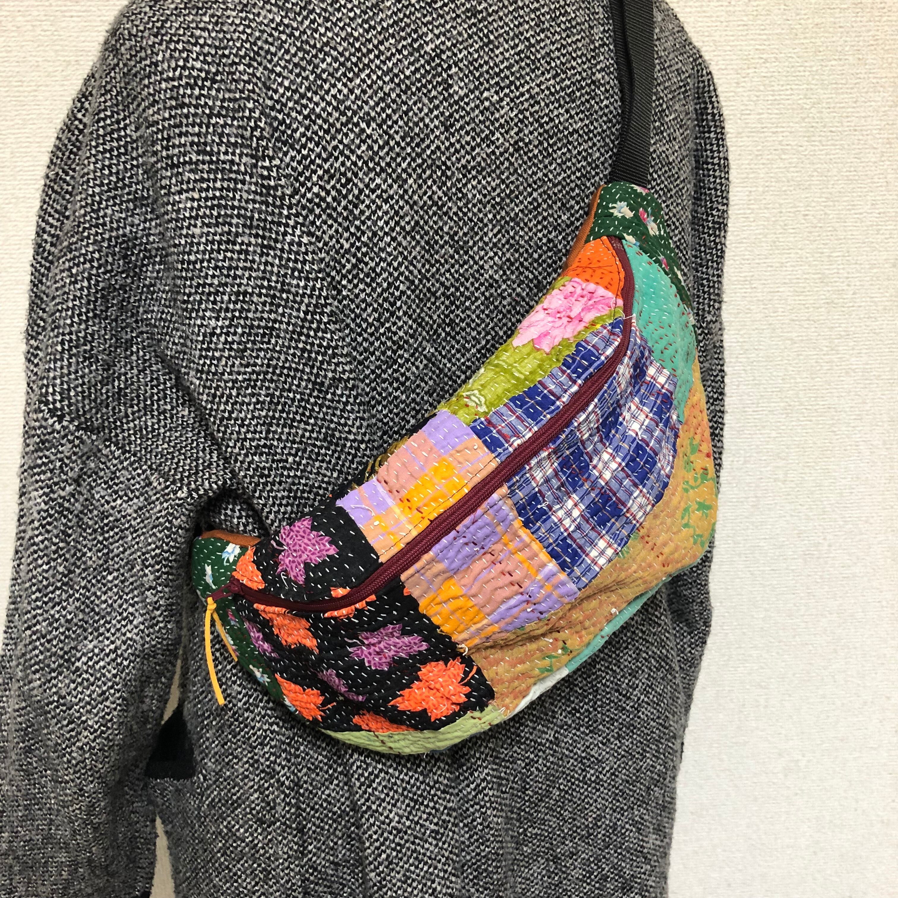 パッチワークラリーキルトのボディバッグ ウエストバッグ 刺し子 刺繍 エスニック リメイク