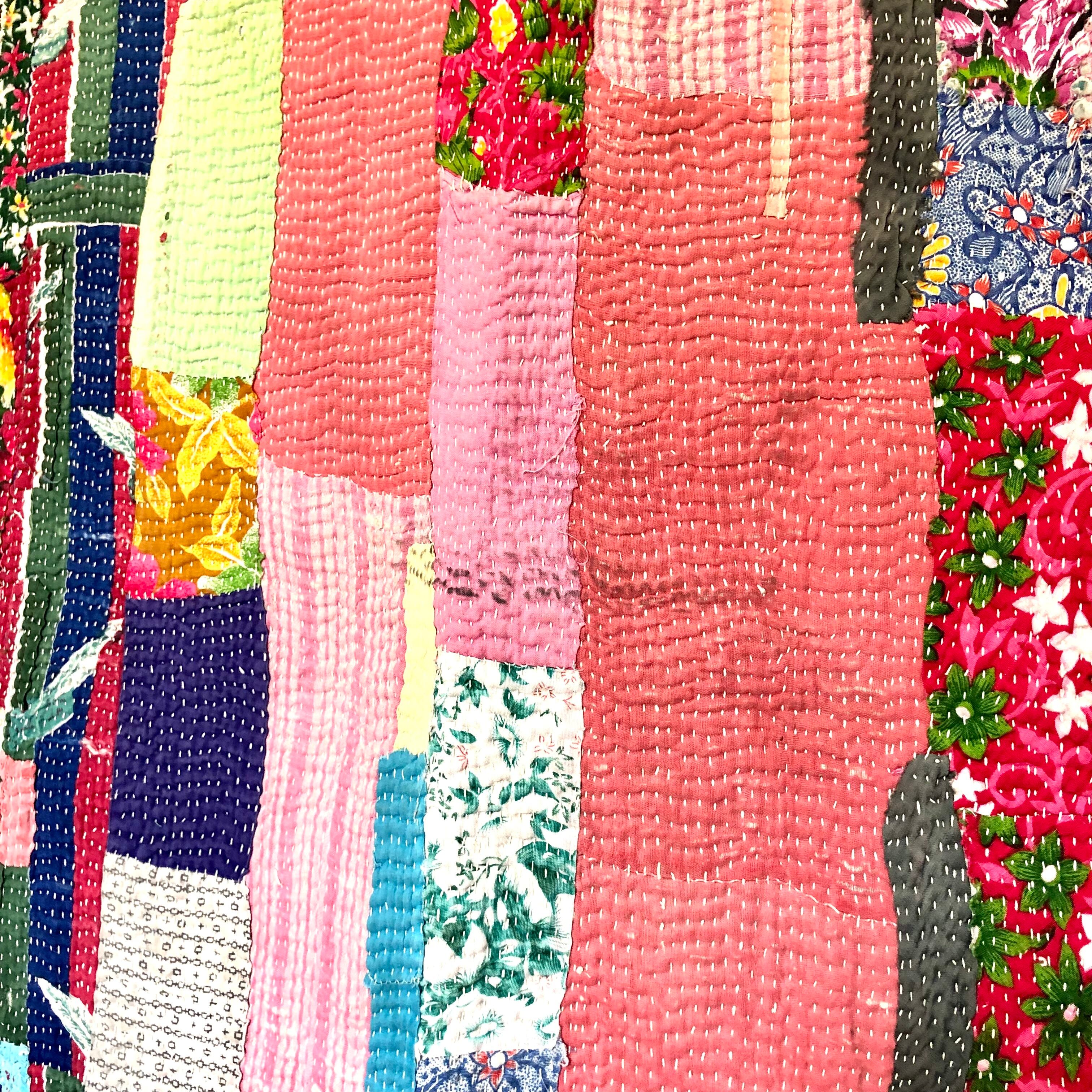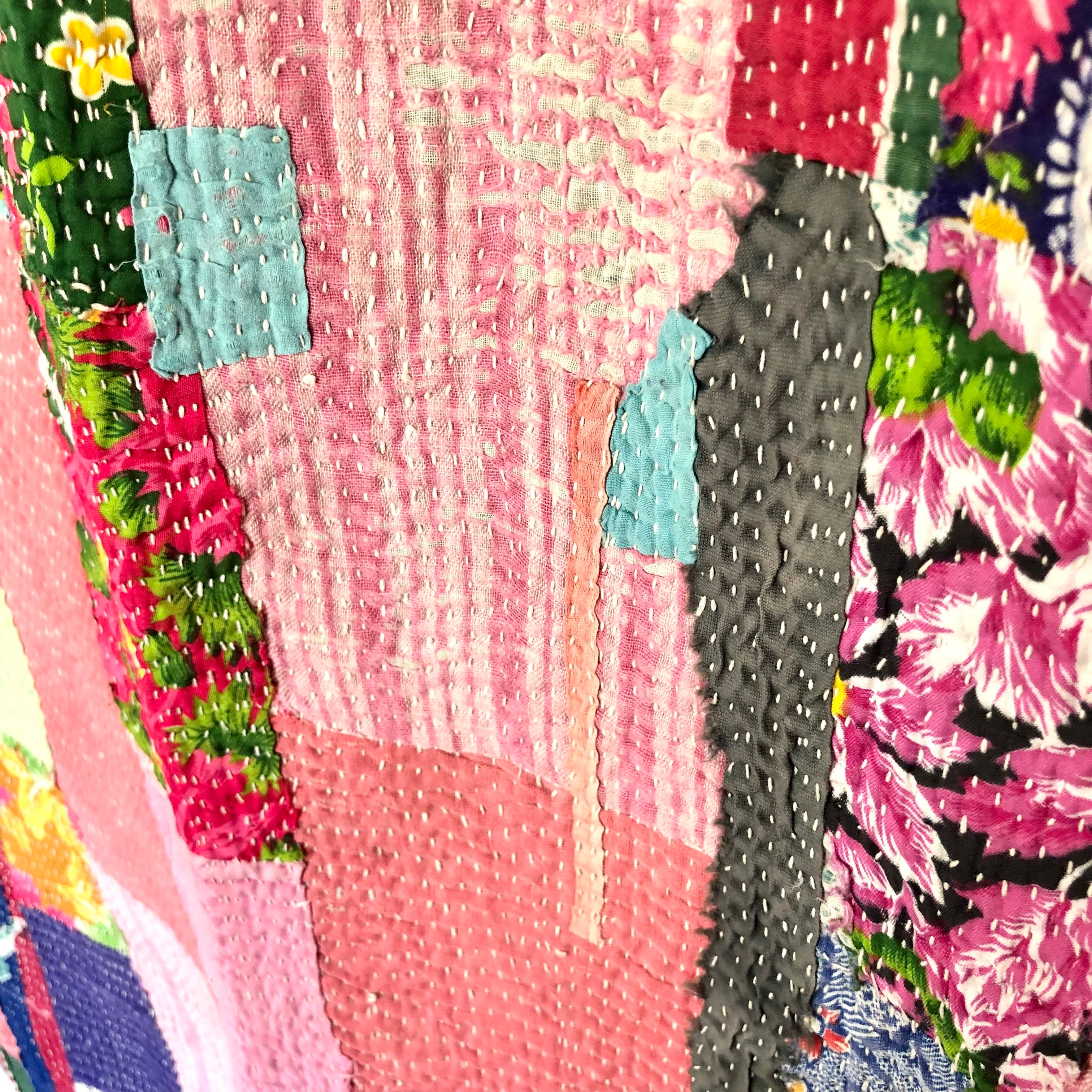強めのピンクのパッチワークラリーキルト 刺し子 刺繍布 インド綿 リメイク 襤褸